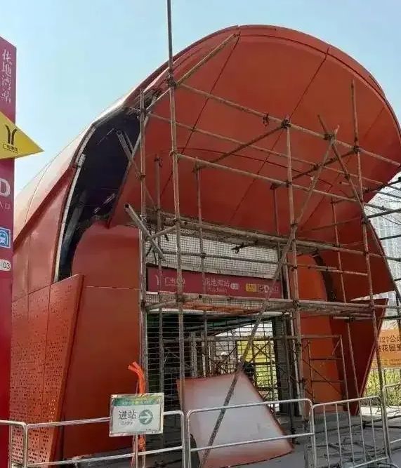 兰州奔流新闻客户端报道,广州地铁工作人员表示,该出入口设计灵感来源于木棉花花瓣,装修完成后外观将是圆柱体,设计颜色本应为木棉花的橙红色,但因照片色差被呈现为深红色。