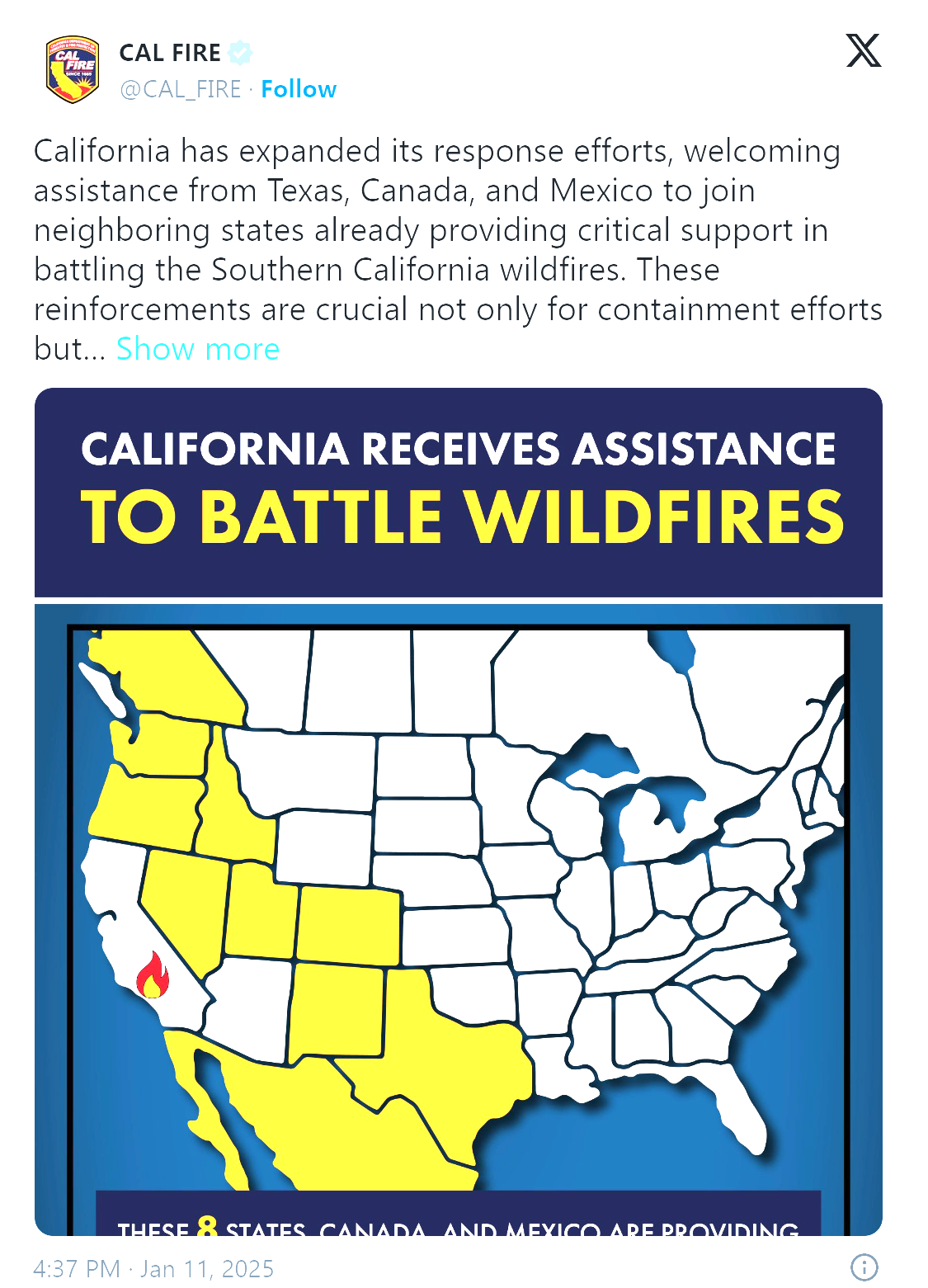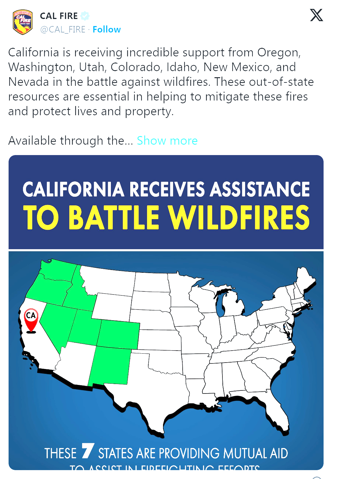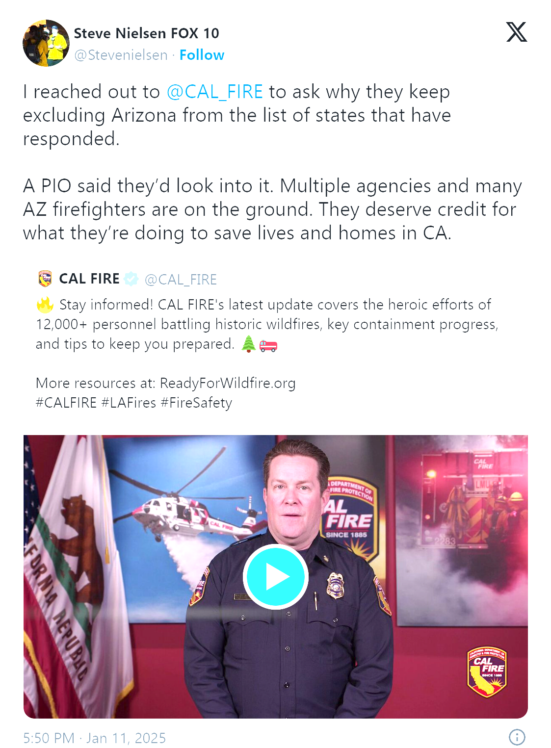 加州消防局11日在其X账户上两次发布了邻近州向南加州提供援助,两次漏掉亚利桑那州。