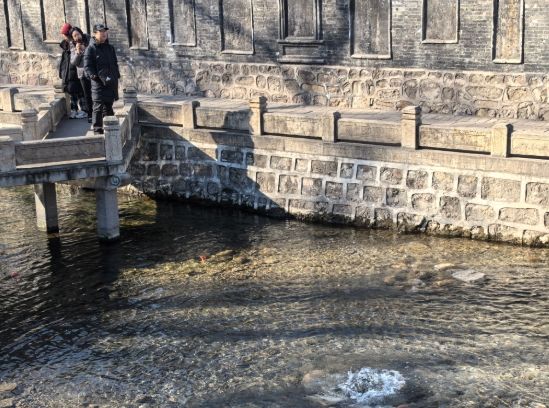 在晋祠看到,不少游客穿梭在难老泉周围,有的探身俯瞰,有的顺流而下,触摸泉水。冬日的暖阳下,泉水被映照得波光粼粼,清澈见底的水面,一眼便可“望穿”。