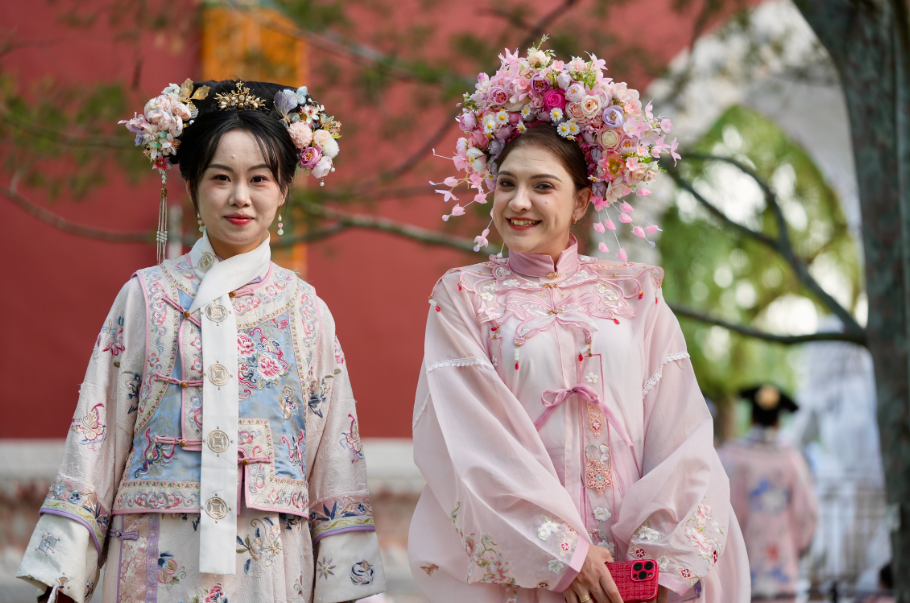 中外游客身着汉服在北京北海公园拍照留念。(图片来源:中新社)