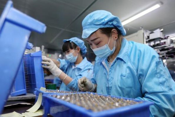 2021年8月7日,在安徽省淮北市高新技术产业开发区,工人在一家锂电池生产企业的车间内作业。(图片来源:新华社资料图)