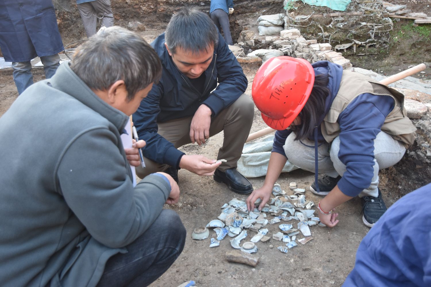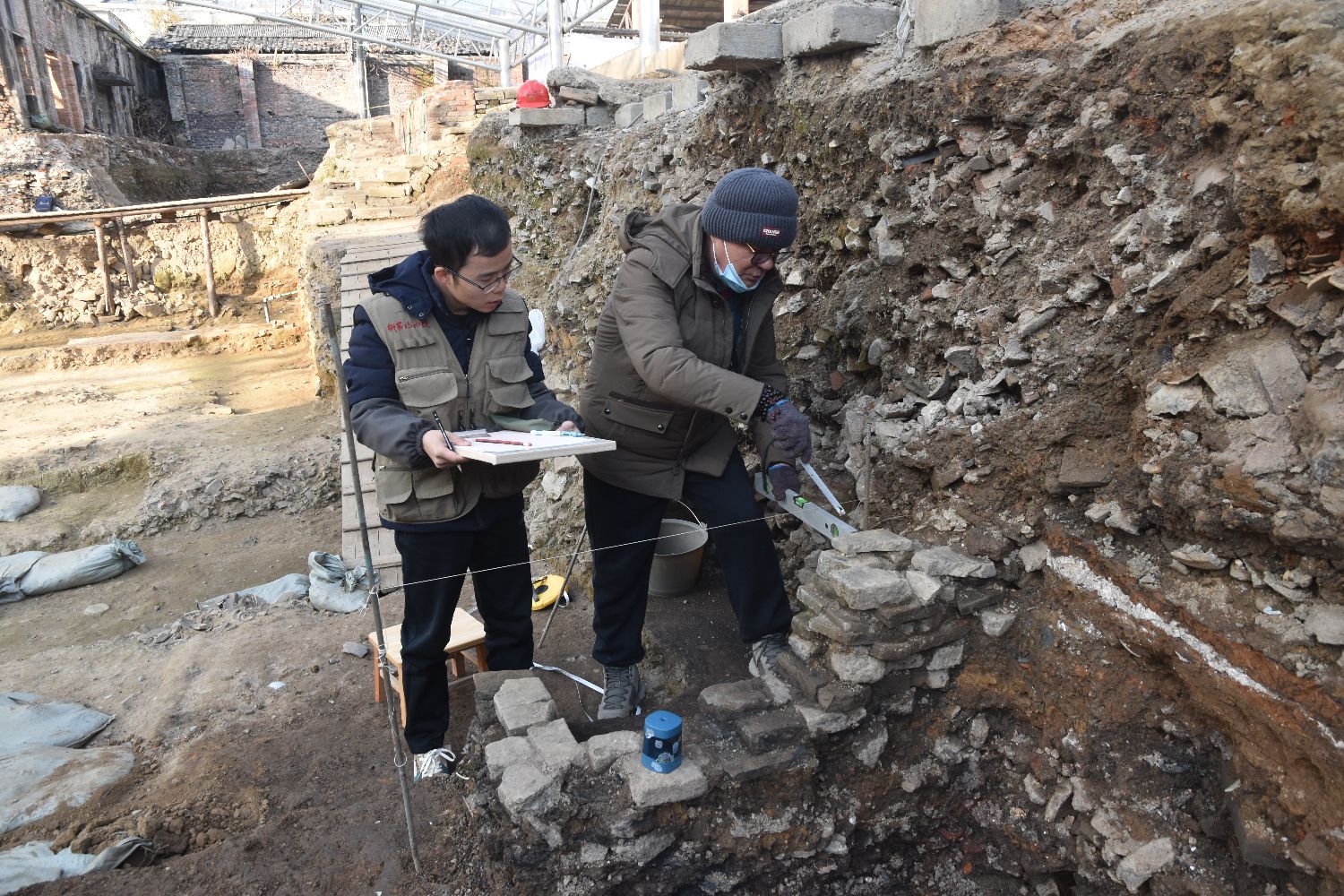 2023年底,考古工作人员正在落马桥遗址进行考古绘图。(图片来源:中新社/景德镇御窑博物院供图)