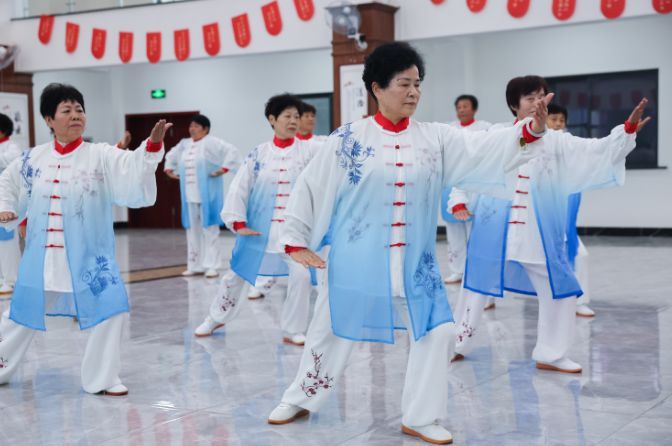 在浙江杭州市临安区太阳镇太阳村老年大学,老人们在练习太极拳。(图片来源:新华社资料图)