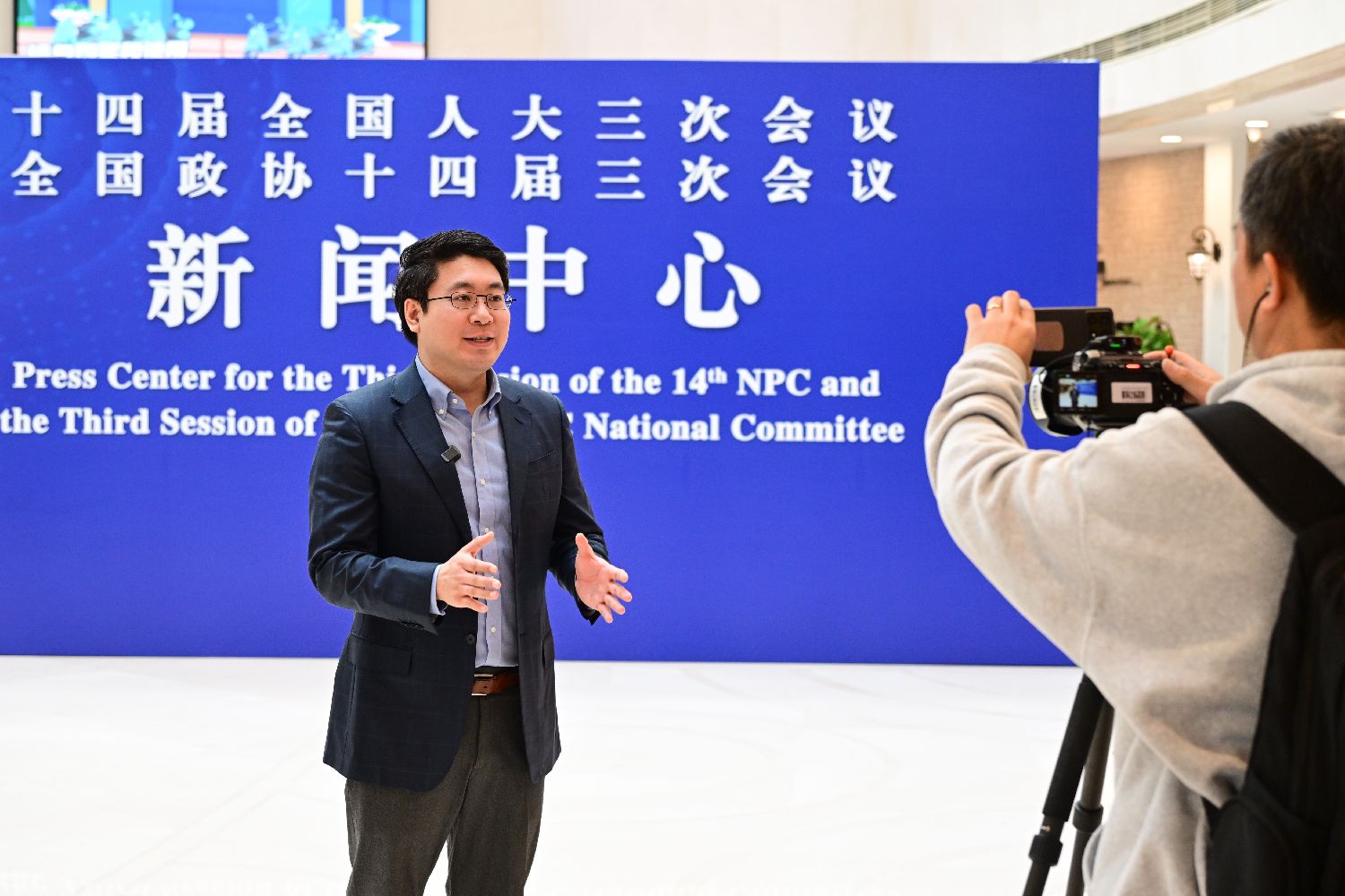 中国全国两会新闻中心设在北京西长安街北侧梅地亚中心。在现场,写有“十四届全国人大三次会议全国政协十四届三次会议新闻中心”的中英文蓝色展板,已被摆放在梅地亚中心一楼入口处的醒目位置。
