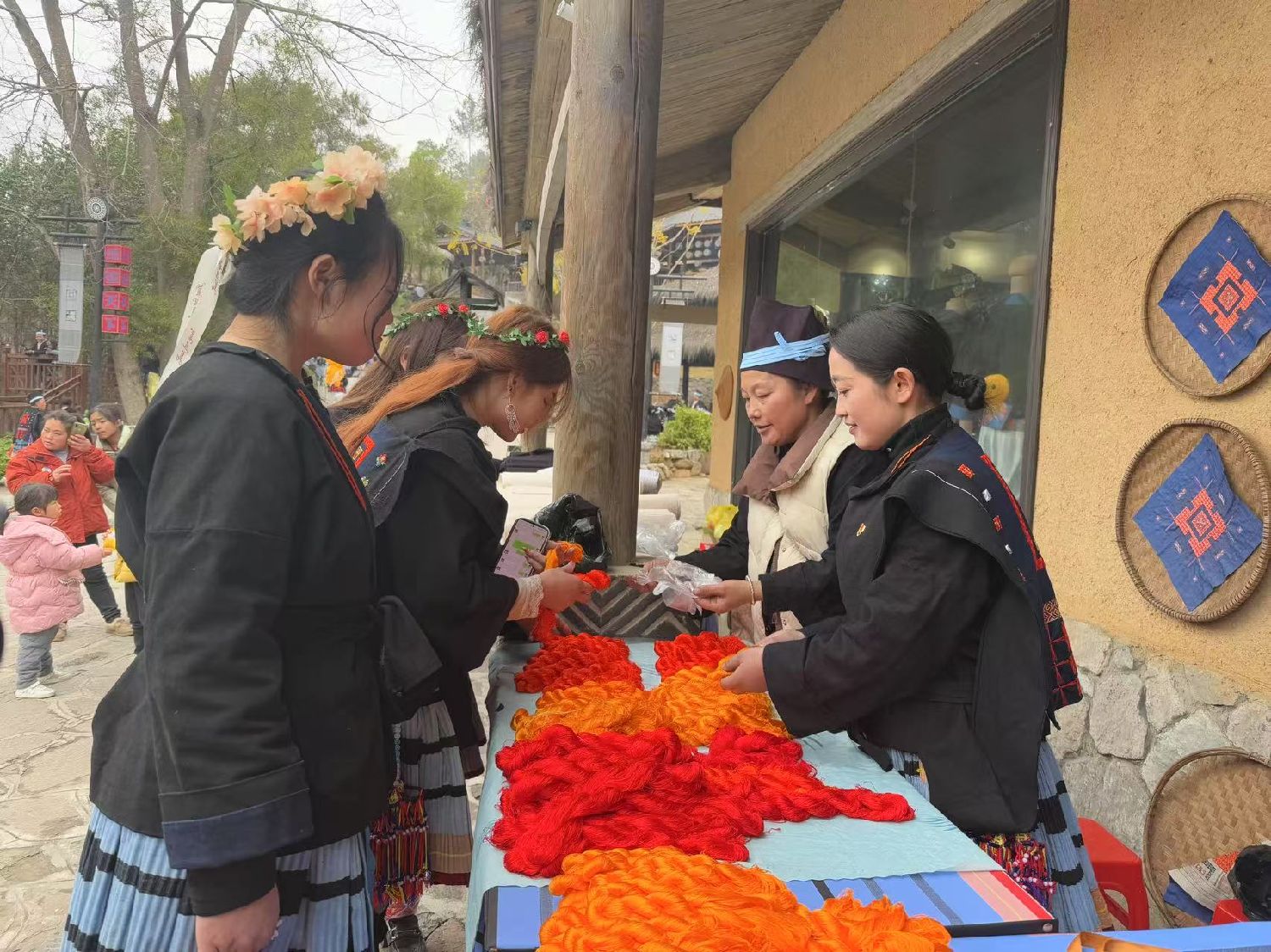 2月13日,“瑶族服饰”广西区级代表性传承人黎凤珍(右二)与女儿黎秋亿(右一)为游客介绍瑶族服饰所用的纱线。(图片来源:中新社)