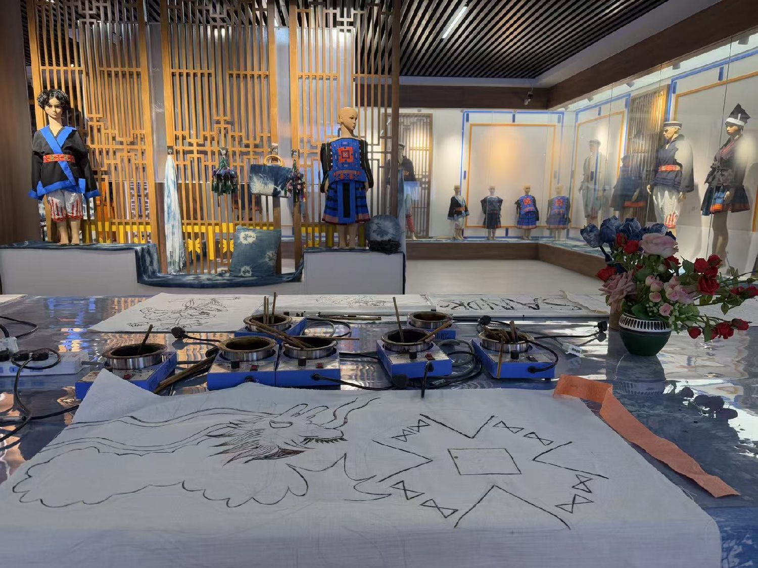 走进白裤瑶服饰展示厅,一幅幅粘膏画布陈列在桌上。黎秋亿告诉记者,待用蓝靛上色、晾洗,再将粘膏煮掉,学员们的粘膏作品就完成了。“在玩中感受非遗,了解非遗,更能激发对非遗的兴趣。”