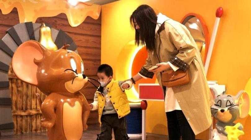 在北京国贸商城,家长带着孩子参观《猫和老鼠》“纵享欢乐”展区。(图片来源:中新网资料图)