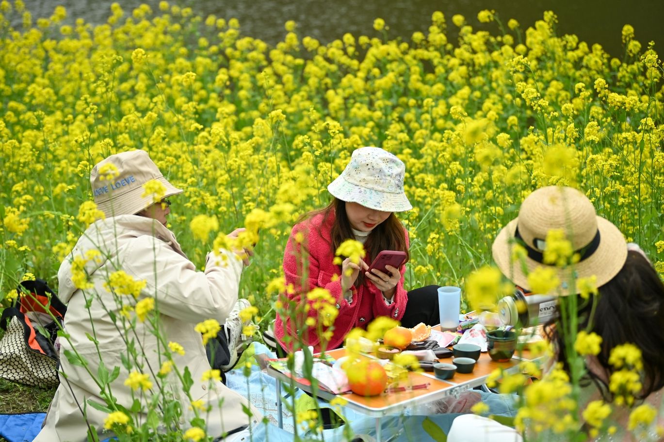 3月12日,四川乐山大佛景区乌尤坝麻浩河两岸成片的金黄油菜花竞相开放。图为游客在乌尤坝麻浩河边金色油菜花海中小憩品茶。(图片来源:中新社)