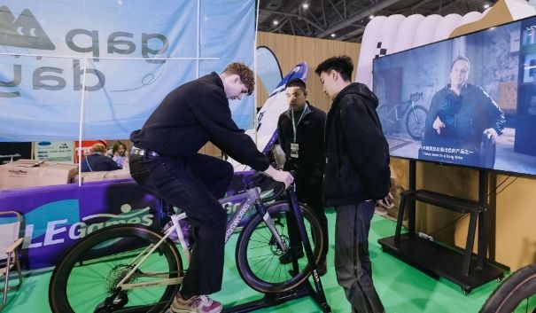 3月30日,在2025杭州国际户外露营生活展上,麦克斯试骑越野自行车。(图片来源:中新社)