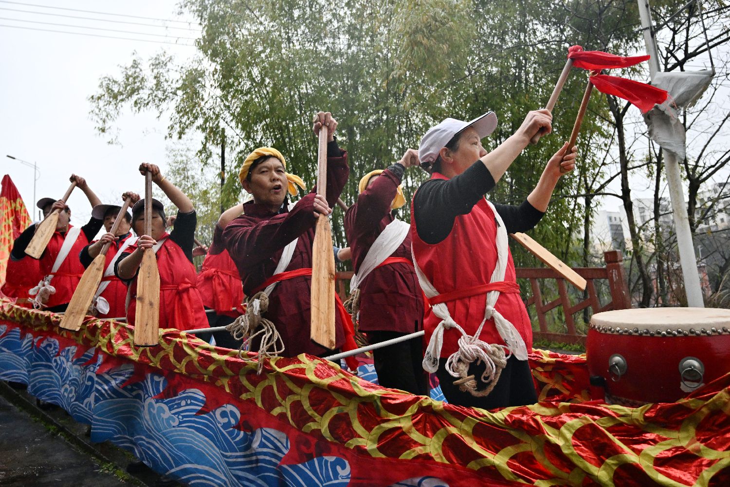 3月5日,号子爱好者在岳池县罗渡镇渠江号子传习所开展旱龙舟、龙舟号子训练。(图片来源:中新社)