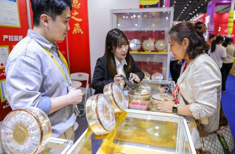 4月14日,在第五届中国国际消费品博览会上,马来西亚燕窝吸引参观者驻足挑选。(图片来源:中新社)