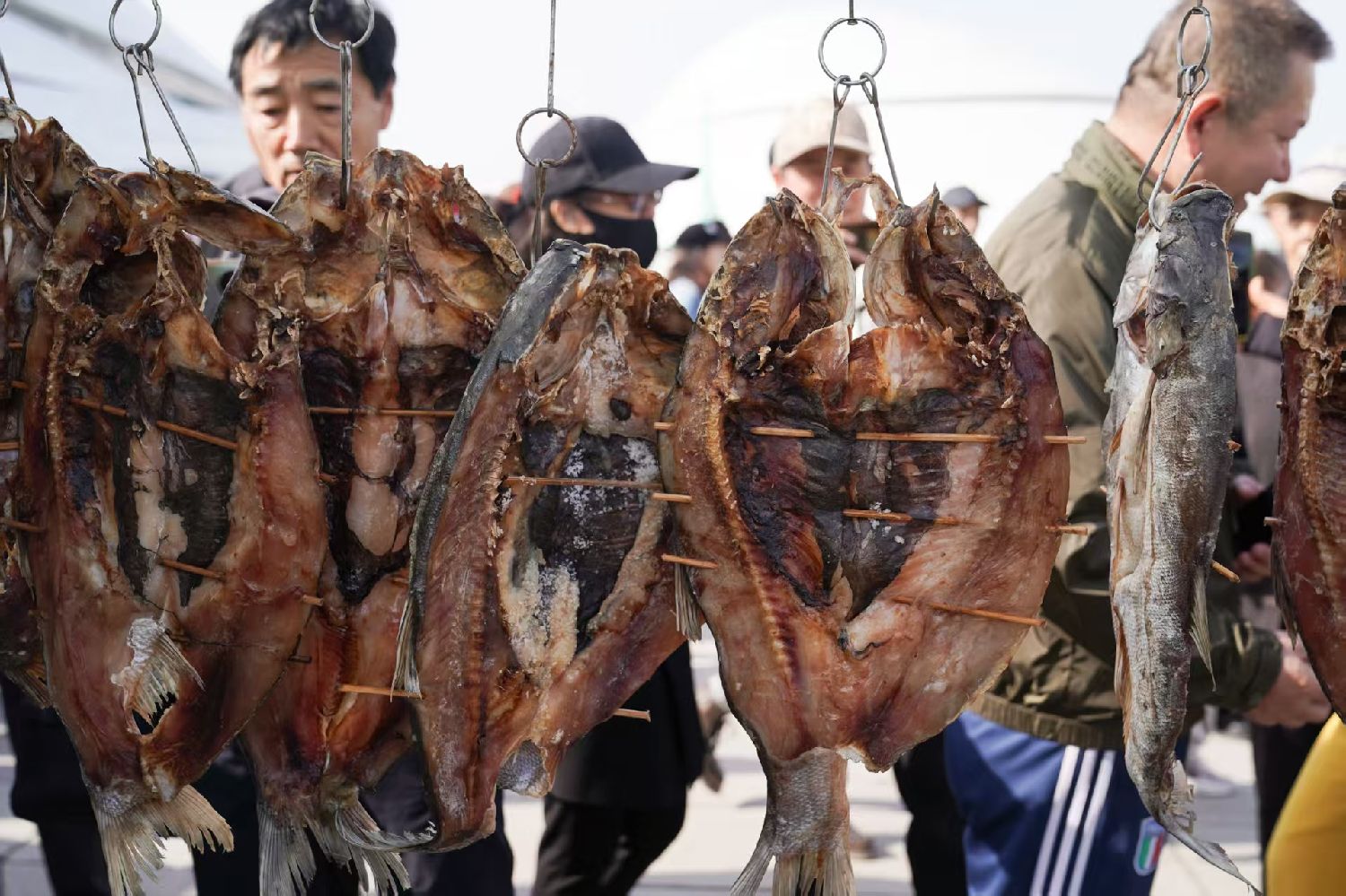 4月16日,哈尔滨市开江民俗文化周现场,美味的江鱼吸引游客。(图片来源:中新社)