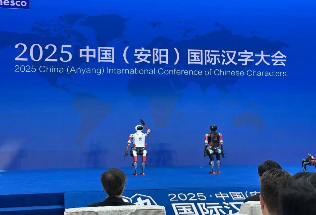中新社报道,20日在河南安阳启幕的2025中国(安阳)国际汉字大会现场,AI机器人“武丁”“妇好”携带机器狗,热情地向与会者打招呼。