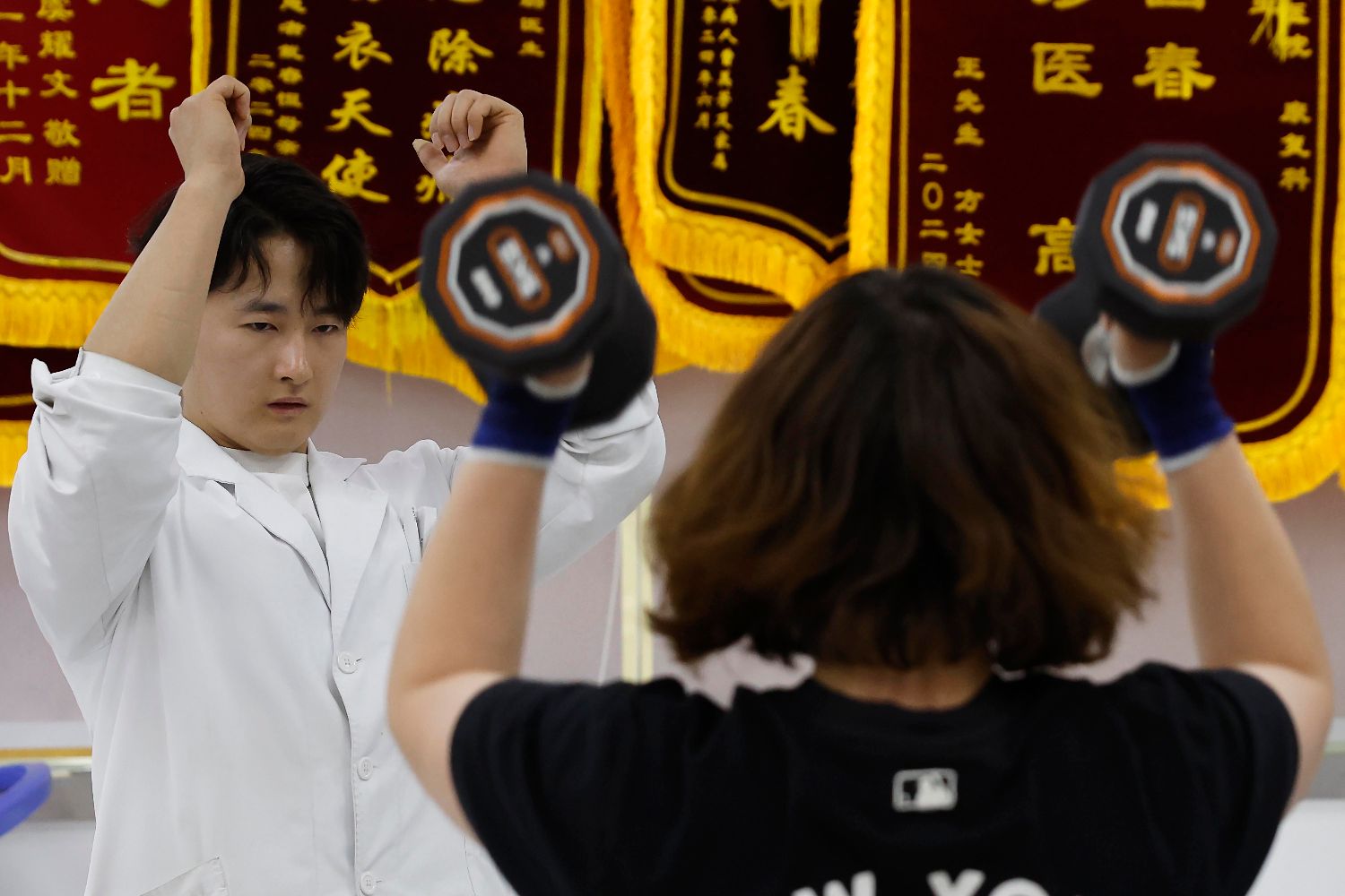 4月2日,上海市黄浦区打浦桥街道社区卫生服务中心健康管理(减重)门诊,治疗师在指导市民进行肌肉力量训练。(图片来源:中新社)