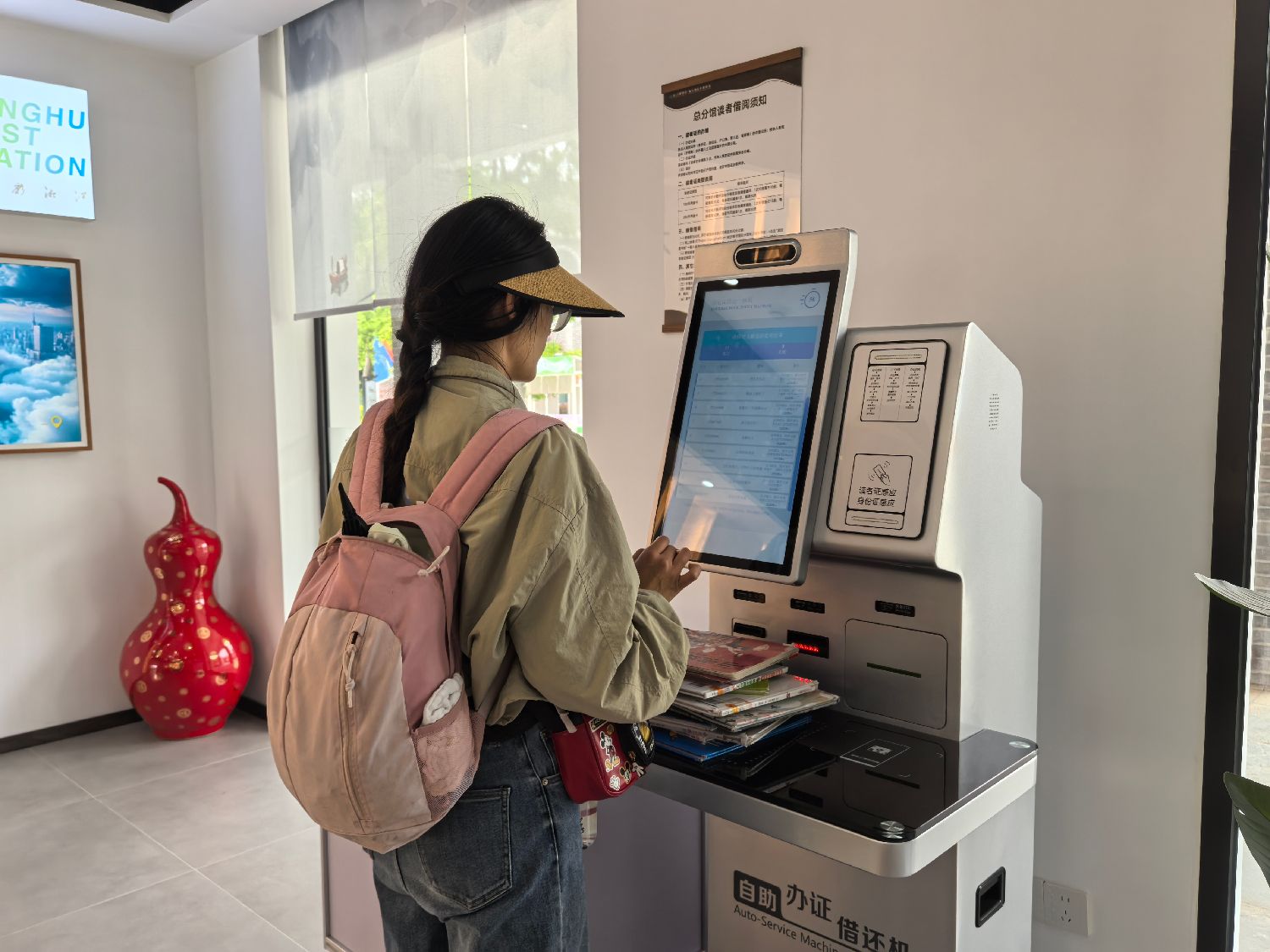2025年4月,开办在湖南洋湖国家湿地公园附近的社区图书馆内,读者正通过借还一体机自助还书。(图片来源:中新社)