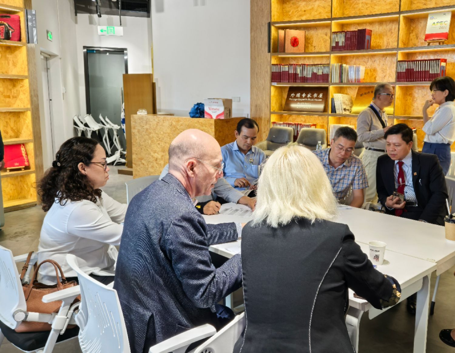2025年4月,海内外人士在湖南洋湖国际社区的外国专家书屋中交流。(图片来源:中新社)