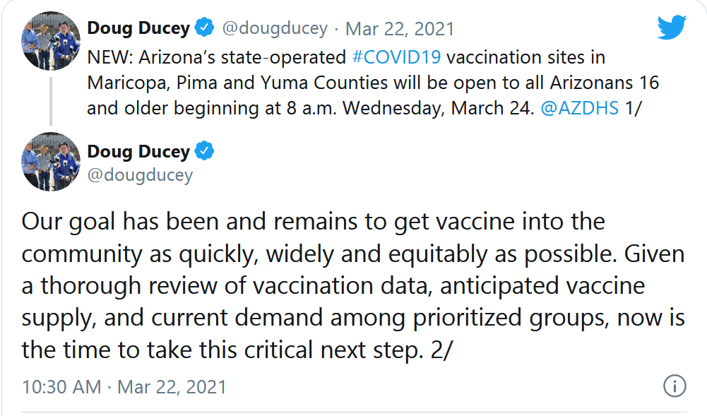 今天宣布的变更推进了一种基于年龄的混合方法,并且上述两郡也已经为一线基本工人进行了疫苗接种。适用于本周在Maricopa和Pima郡的州立地点仍然可用的预约。