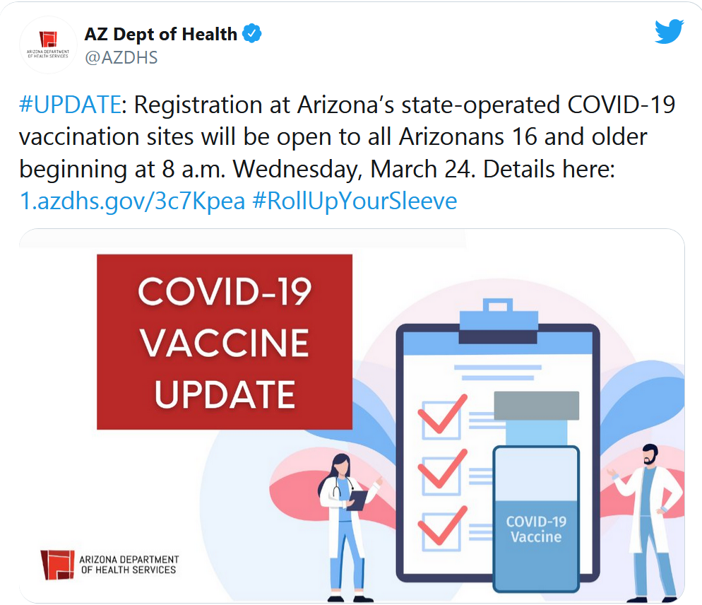 【本报讯】亚利桑那州州长道格·杜西和亚利桑那州公共卫生厅今早宣布,从3月24日(周三)上午8时起,Maricopa、Pima和Yuma三郡将开放给所有亚利桑那州16岁及以上居民注册疫苗接种。