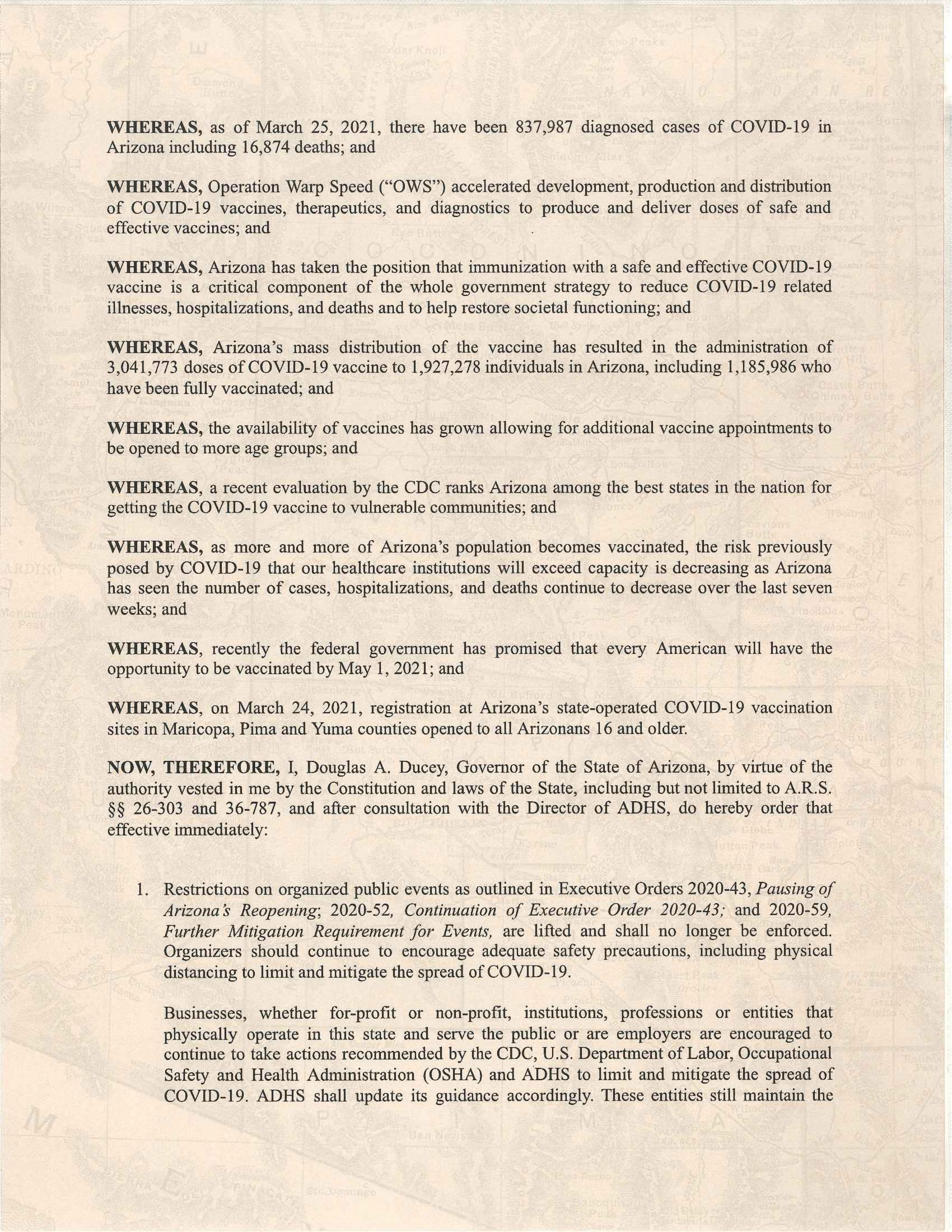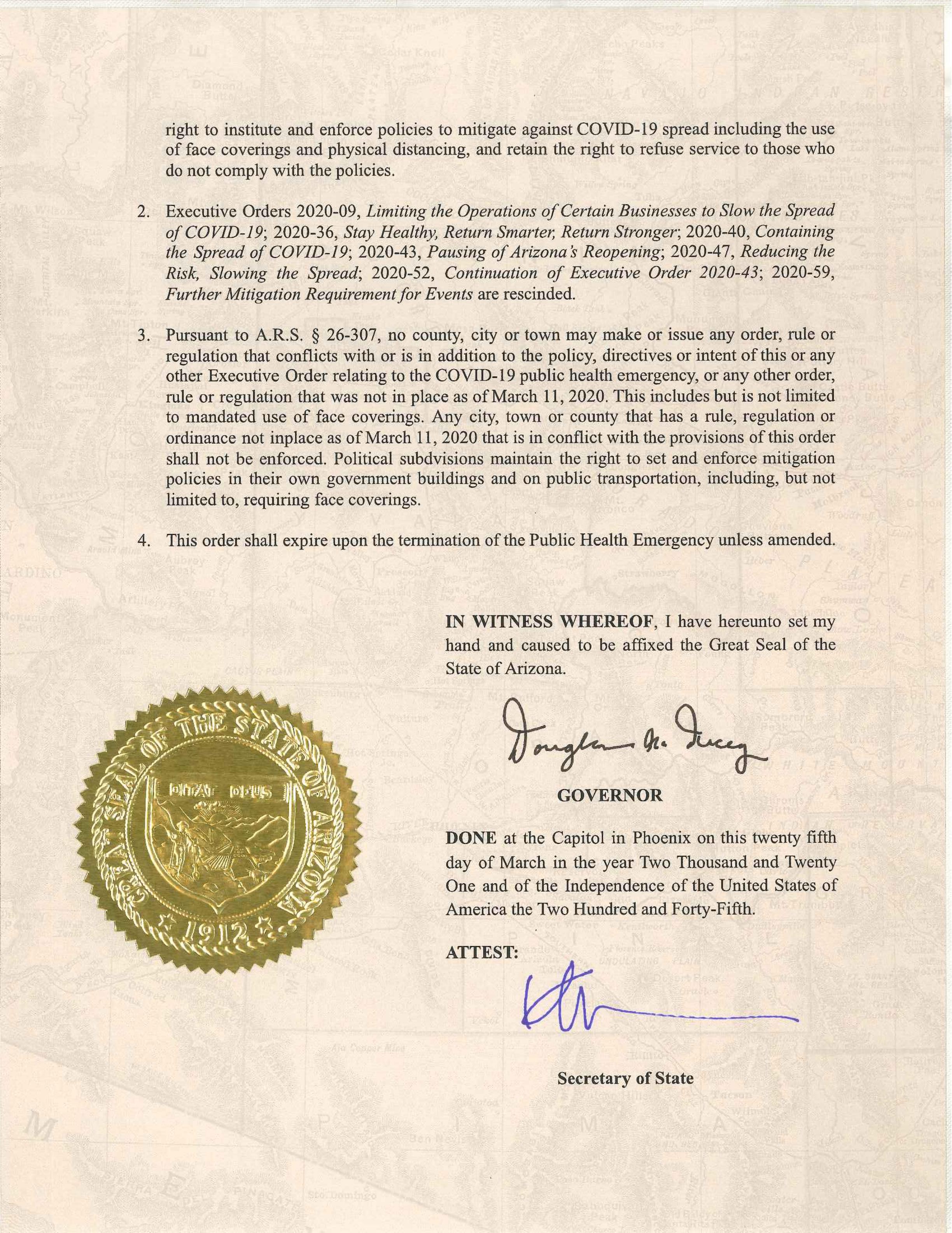 州长仍在鼓励亚利桑那州居民和企业采取负责任的行动防疫。“戴口罩,保持社交距离,生病时呆在家里,经常洗手,并接种疫苗–安全,有效,免费,”杜西在推特上写道。