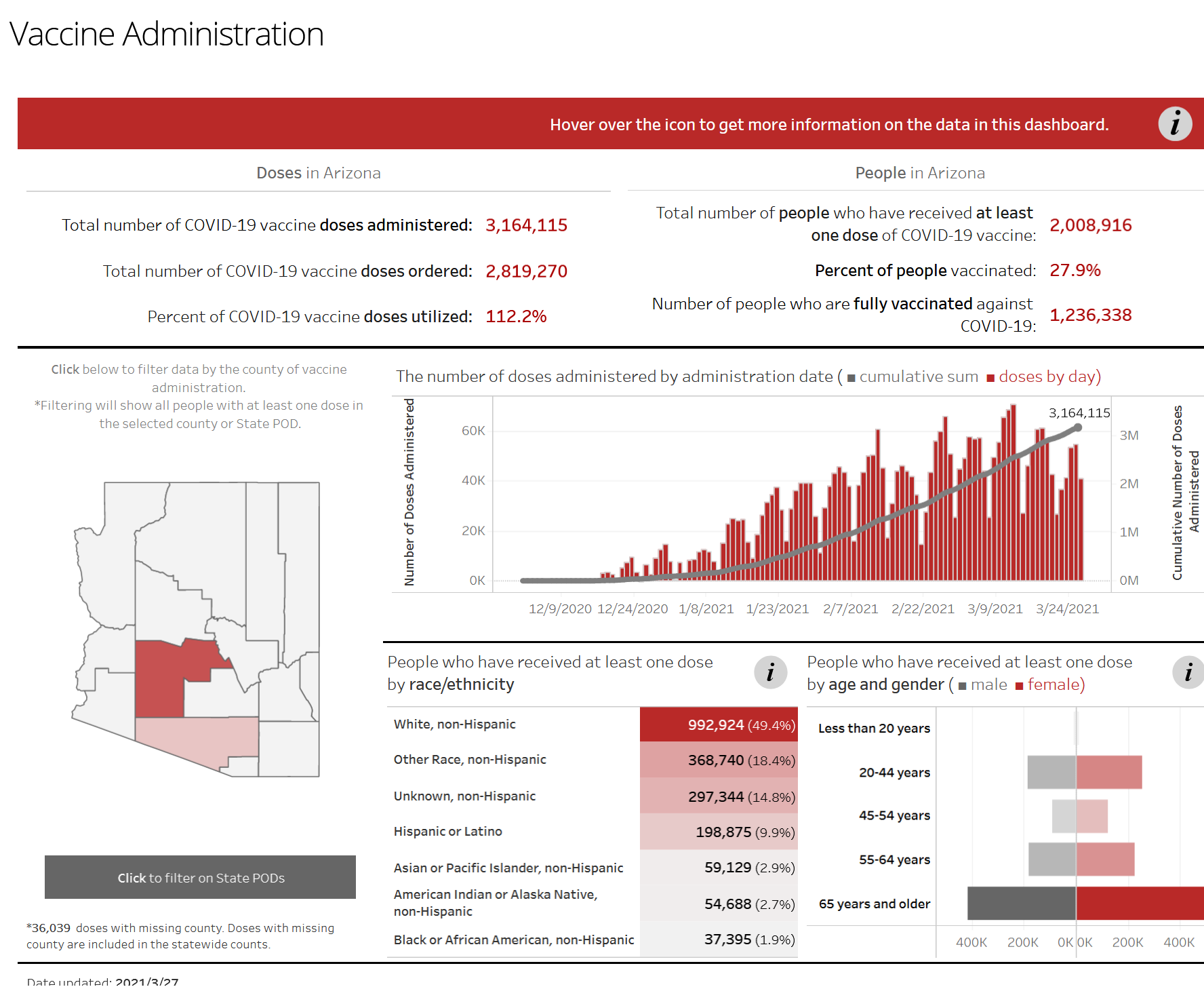 截止至周五,亚利桑那州已完成超过316万剂疫苗接种。其中200万人完成了至少一剂注射,超过123万人完成了两剂注射,全州疫苗覆盖率27.9%。