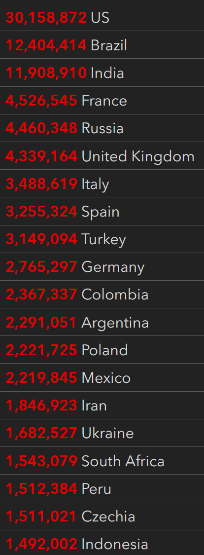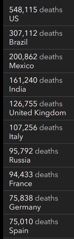 根据JHU全球新冠数据跟踪,截止至美东时间周六上午7:25,全球确诊人数累计126,280,989例,死亡累计2,769,934人。美国为全世界确诊和死亡人数最多的国家,累计确诊30,158,872例,死亡累计548,115。按County分,美国确诊人数最多的郡前三名是Los Angeles、Maricopa和Cook。死亡人数最多的三个郡分别是Los Angeles、Cook和Maricopa。