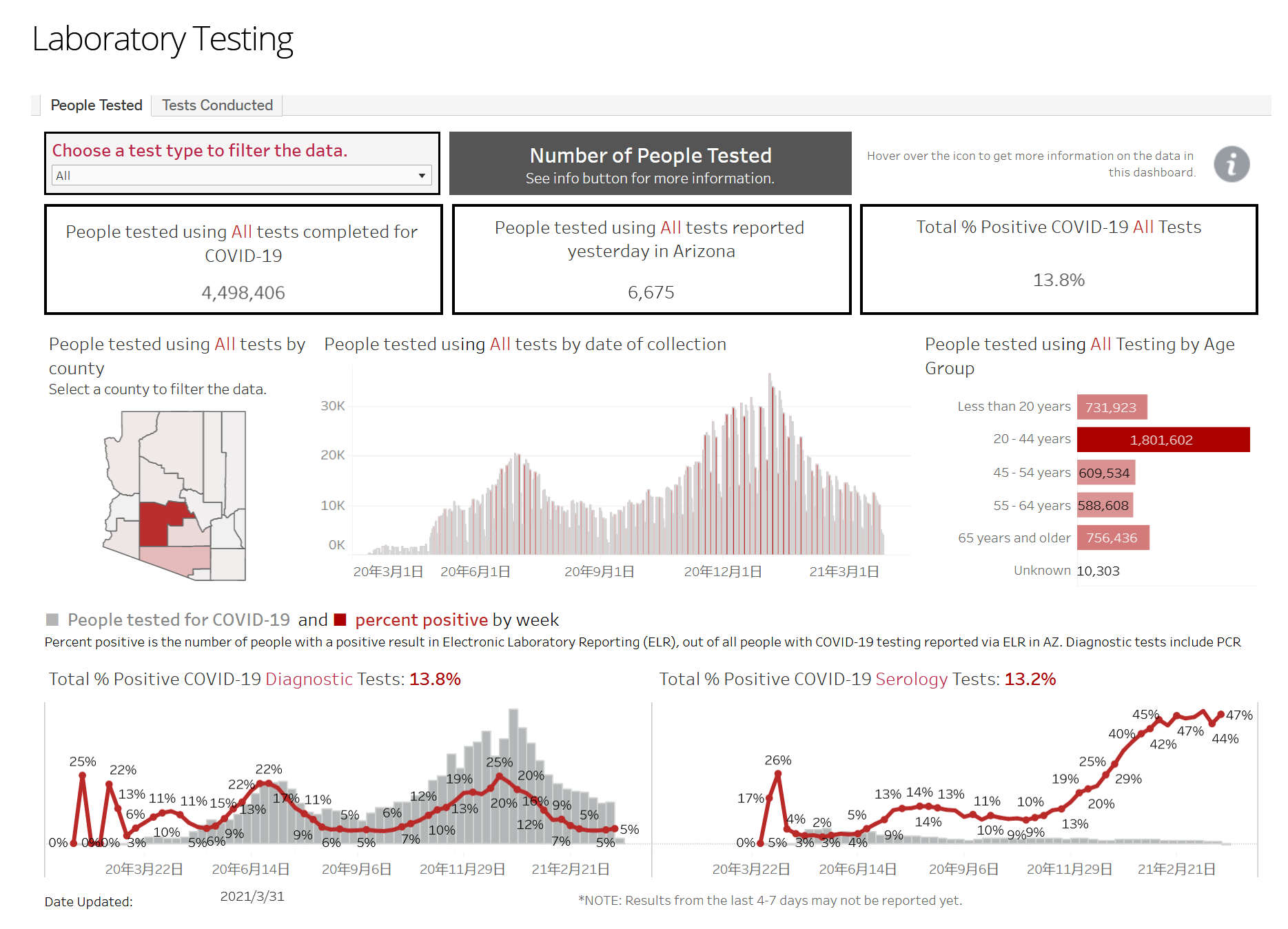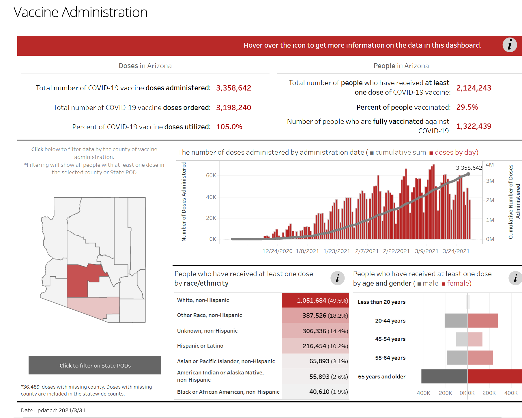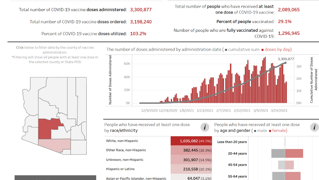 截止至周二,亚利桑那州已完成超过335万剂疫苗接种,212万人完成了至少一剂注射,超132万人完成了两剂注射,全州疫苗覆盖率29.5%。