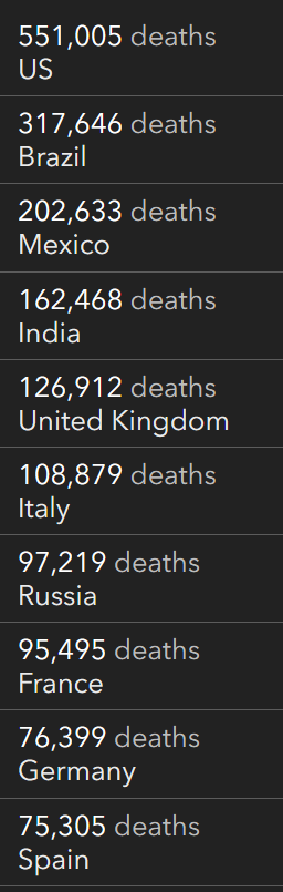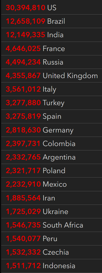 根据JHU全球新冠数据跟踪,截止至美东时间周三上午6:26,全球确诊人数累计128,377,922例,死亡累计2,806,679人。美国为全世界确诊和死亡人数最多的国家,累计确诊30,394,810例,死亡累计551,005。按County分,美国确诊人数最多的郡前三名是Los Angeles、Maricopa和Cook。死亡人数最多的三个郡分别是Los Angeles、Cook和Maricopa。