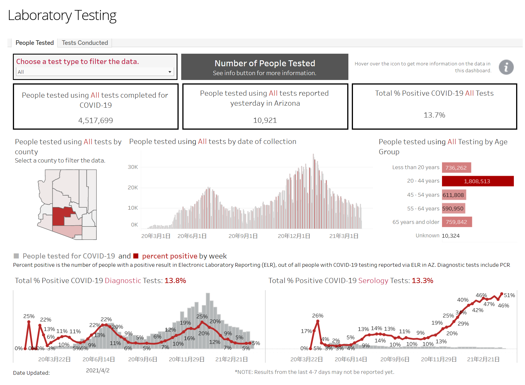 【本报讯】亚利桑那州健康服务部2021年4月2日星期四五上午发布新冠数据,死亡增12人,累计16,989人,确诊人数增加940例,共843,132例。AZDHS表示,由120例来自一个实验室的积压报告。但是,无论有没有积压,这个数字是3月12日以来最高水平。
