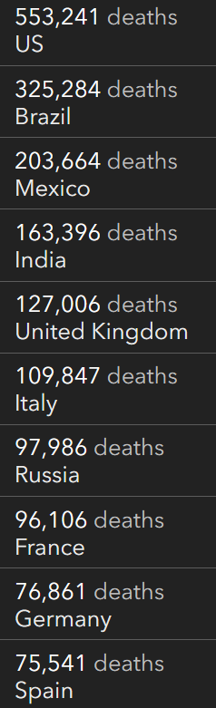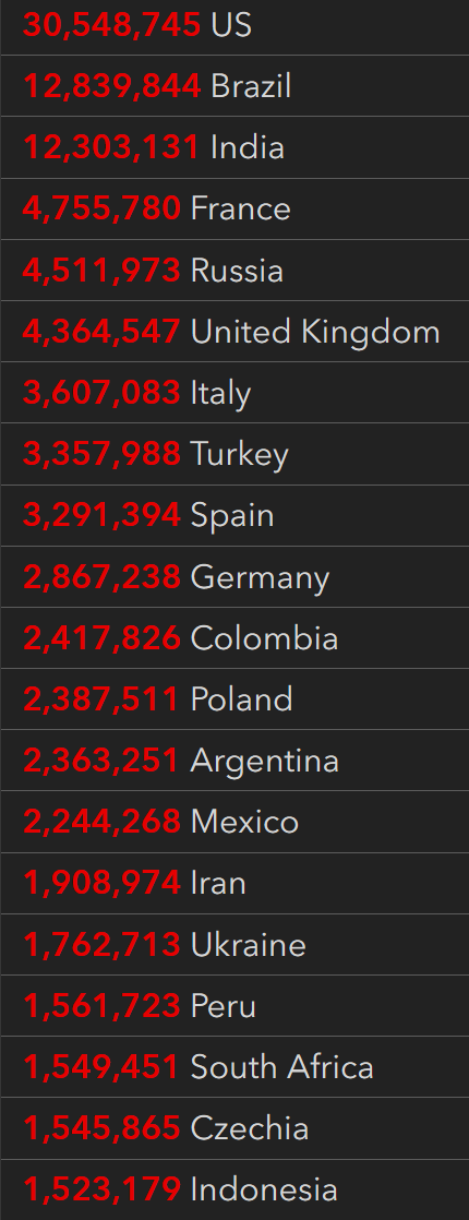 根据JHU全球新冠数据跟踪,截止至美东时间周五上午7:20,全球确诊人数累计129,783,124例,死亡累计2,830,518人。美国为全世界确诊和死亡人数最多的国家,累计确诊30,543,545例,死亡累计553,214。按County分,美国确诊人数最多的郡前三名是Los Angeles、Maricopa和Cook。死亡人数最多的三个郡分别是Los Angeles、Maricopa和Cook。