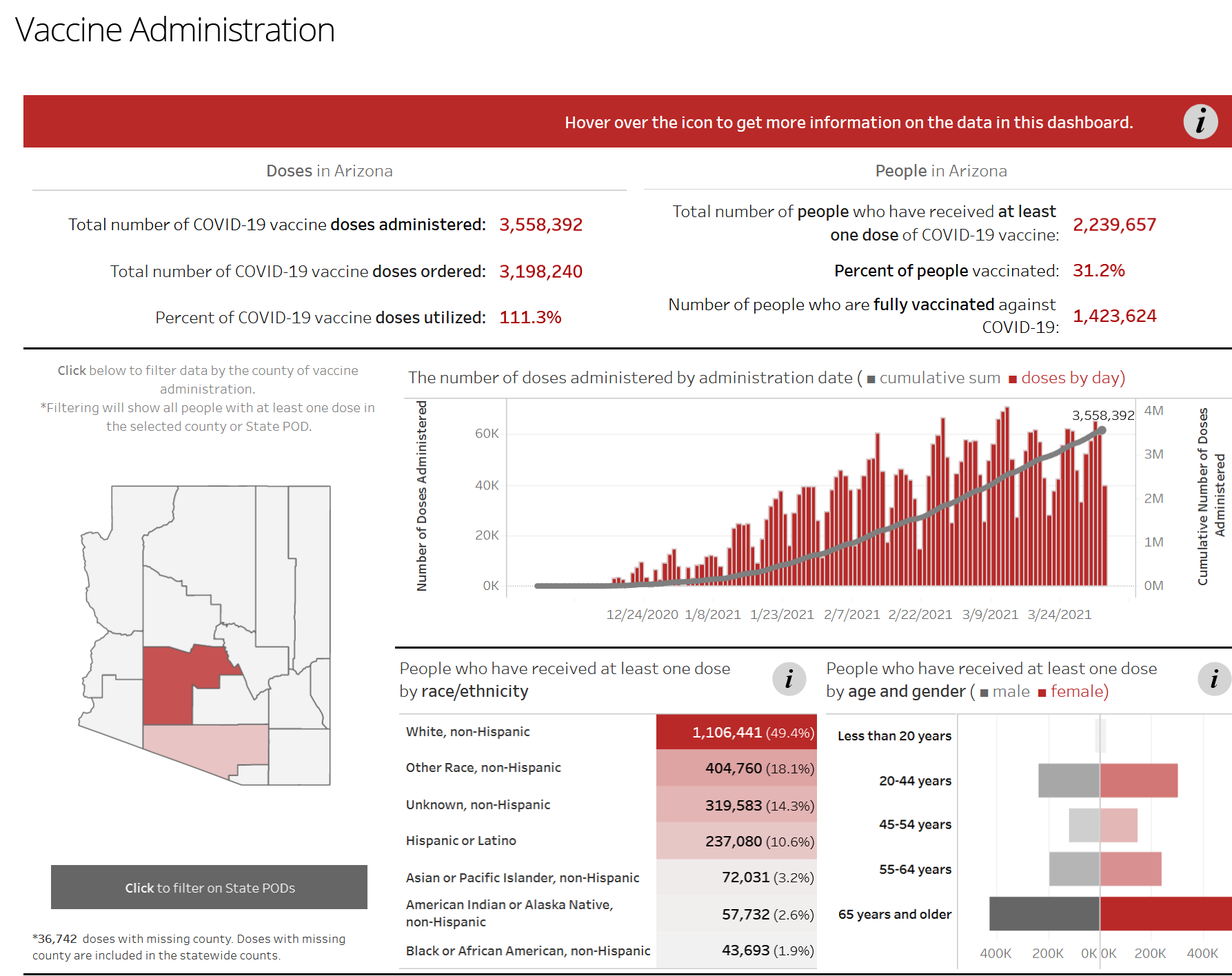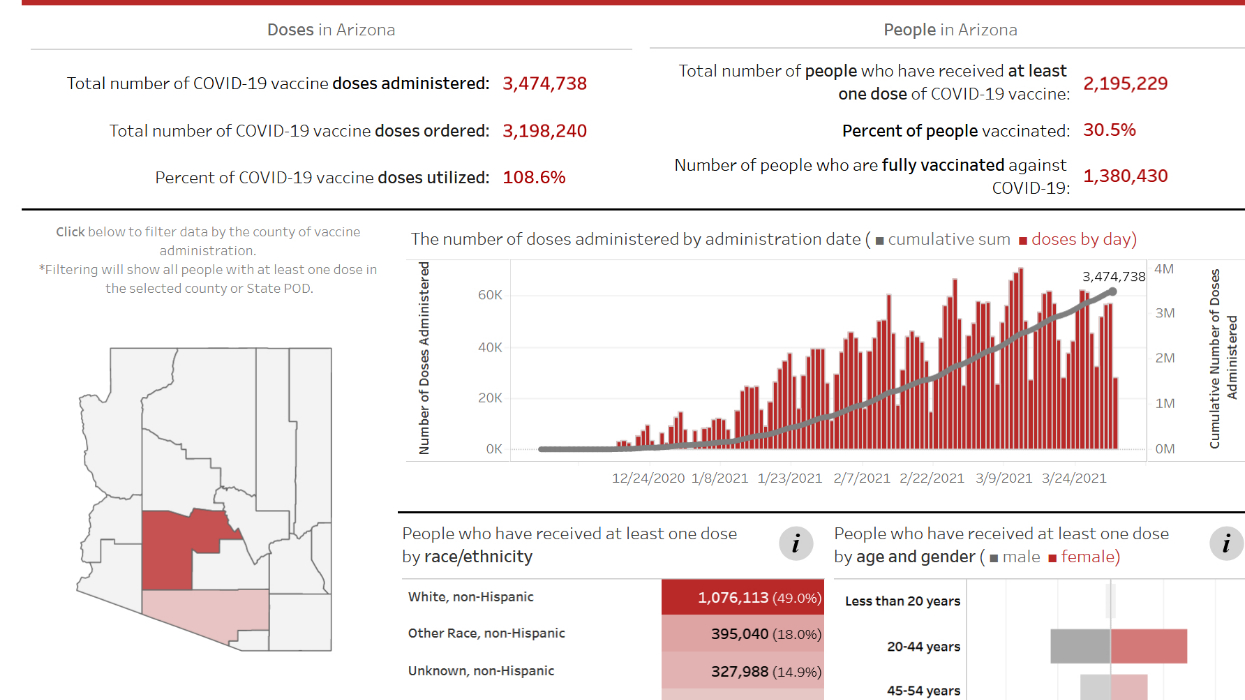 截止至周五,亚利桑那州已完成近355万剂疫苗接种,223万人完成了至少一剂注射,超142万人完成了两剂注射,全州疫苗覆盖率31.2%。