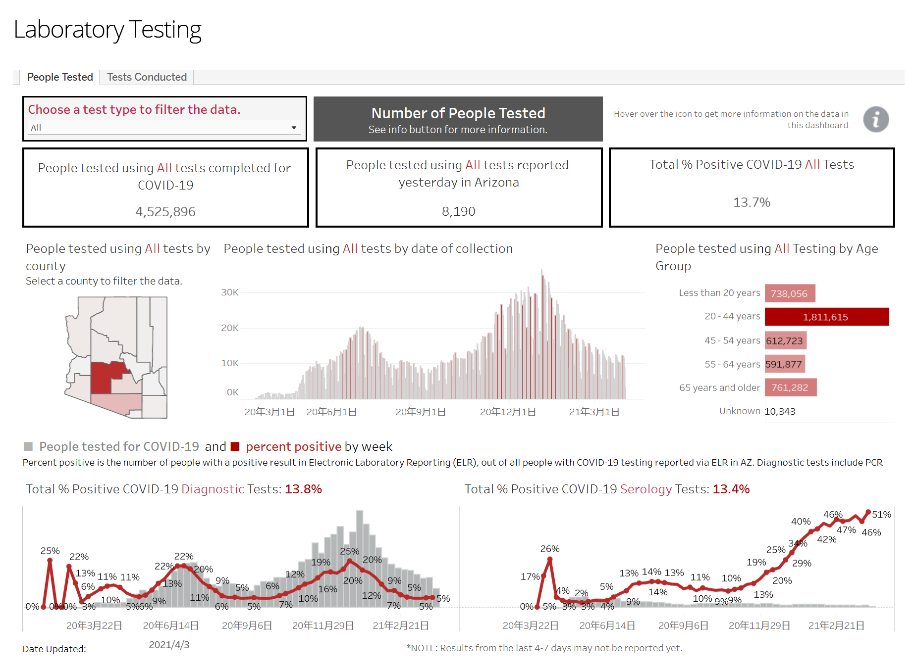 已知进行了4,066,156次Diagnostic(诊断)测试,包括昨天的7,386例,阳性率为13.8%。Serology检测(也称血清测试)进行了459,740次检测,包括昨天的804次,阳性率13.4%。