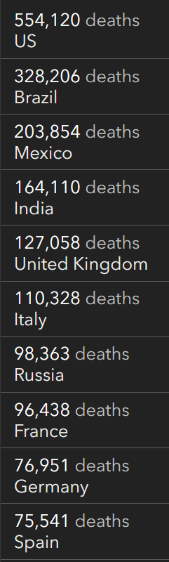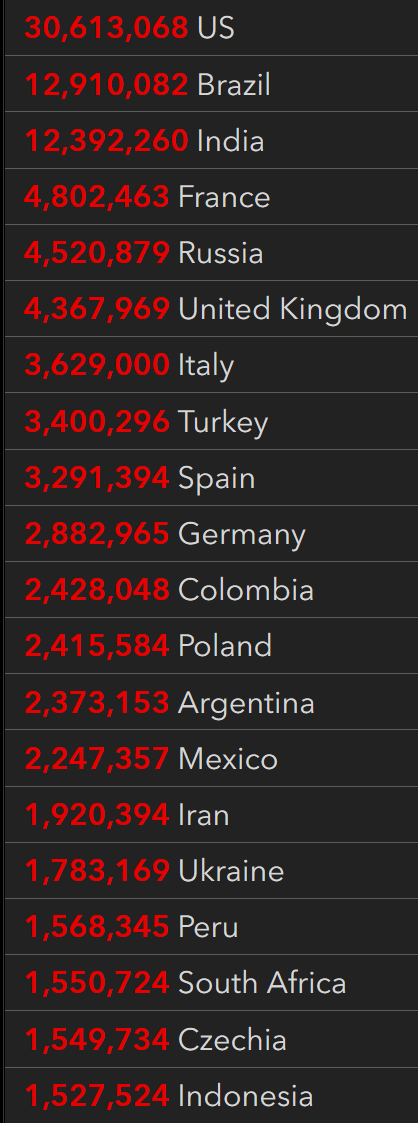 根据JHU全球新冠数据跟踪,截止至美东时间周六上午7:21,全球确诊人数累计130,397,449例,死亡累计2,840,462人。美国为全世界确诊和死亡人数最多的国家,累计确诊30,613,068例,死亡累计554,120。按County分,美国确诊人数最多的郡前三名是Los Angeles、Maricopa和Cook。死亡人数最多的三个郡分别是Los Angeles、Maricopa和Cook。
