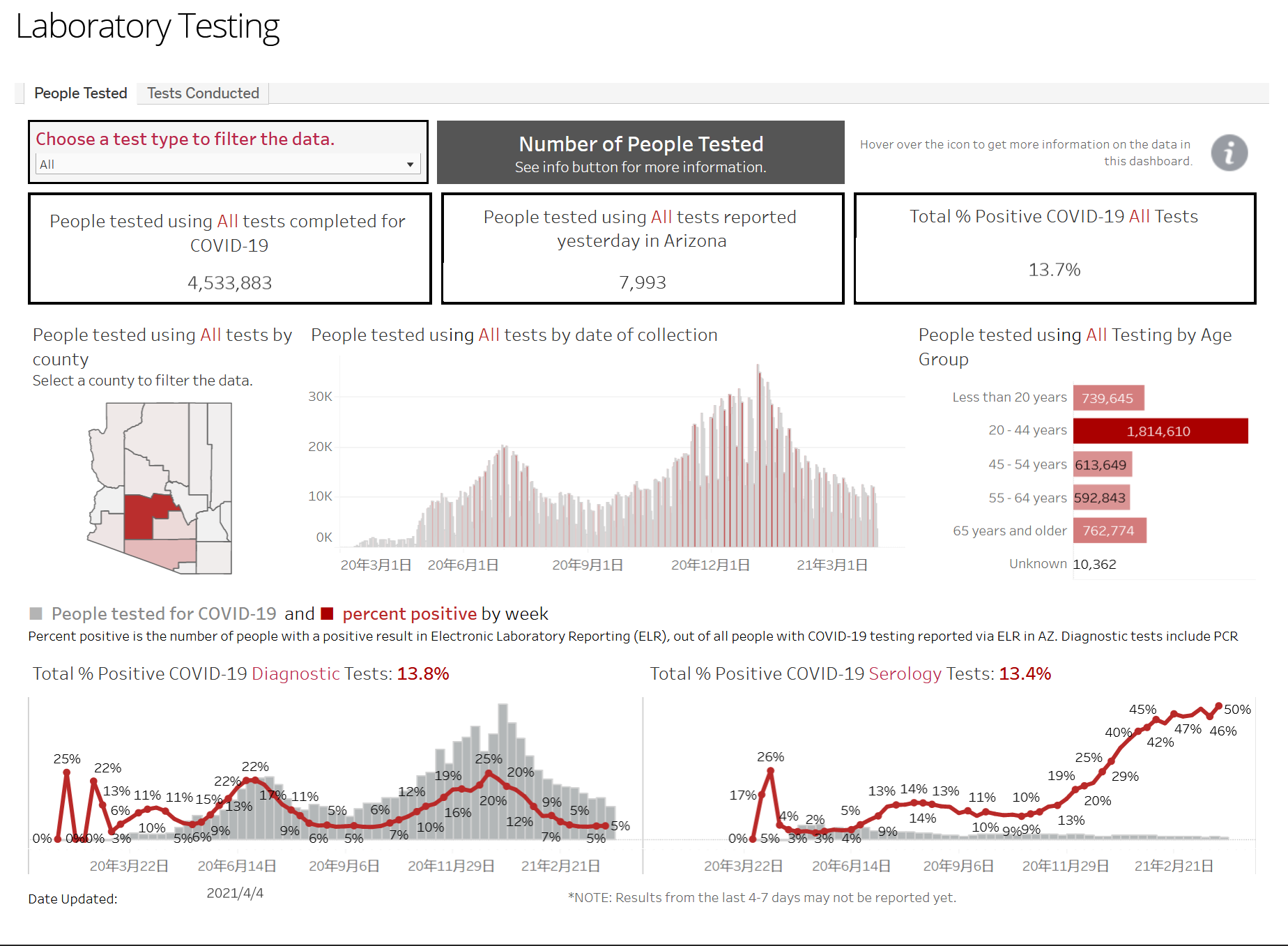 【本报讯】亚利桑那州健康服务部2021年4月4日星期日上午发布新冠数据,死亡-1人,累计16,990人,确诊人数增加406例,共844,302例。