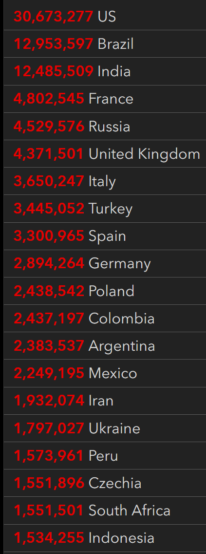 根据JHU全球新冠数据跟踪,截止至美东时间周日上午7:20,全球确诊人数累计130,917,035例,死亡累计2,848,439人。美国为全世界确诊和死亡人数最多的国家,累计确诊30,673,277例,死亡累计554,781。按County分,美国确诊人数最多的郡前三名是Los Angeles、Maricopa和Cook。死亡人数最多的三个郡分别是Los Angeles、Maricopa和Cook。