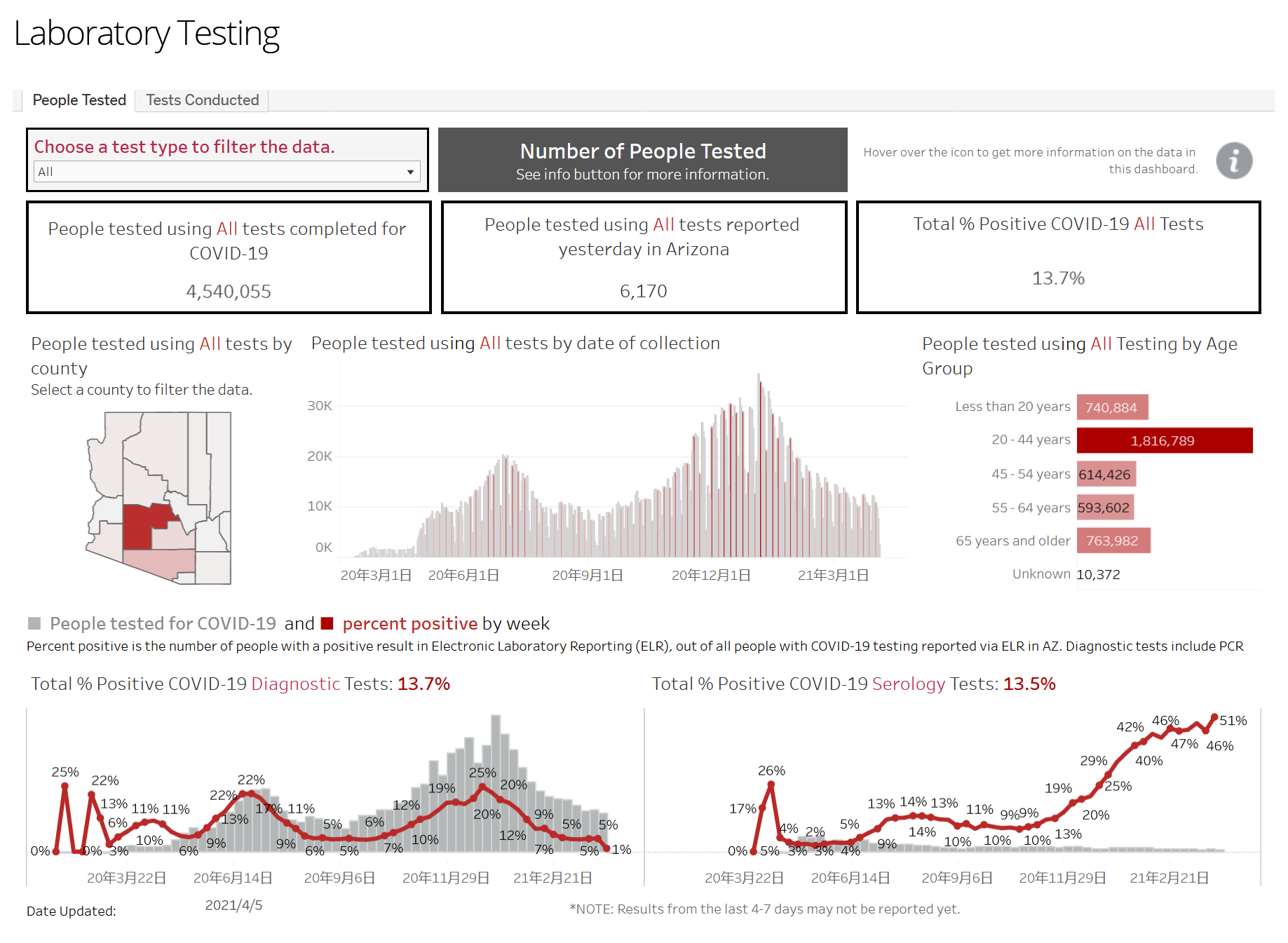 已知进行了4,079,122次Diagnostic(诊断)测试,包括昨天的5,487例,阳性率为13.7%。Serology检测(也称血清测试)进行了460,933次检测,包括昨天的683次,阳性率13.5%。亚利桑那州每周对COVID-19诊断测试的阳性率是病毒在社区中传播的指标,已连续5周保持在5%。
