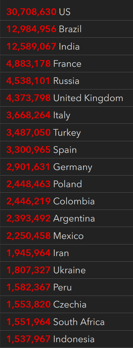 根据JHU全球新冠数据跟踪,截止至美东时间周一上午8:20,全球确诊人数累计131,435,555例,死亡累计2,854,923人。美国为全世界确诊和死亡人数最多的国家,累计确诊30,708,630例,死亡累计555,021。按County分,美国确诊人数最多的郡前三名是Los Angeles、Maricopa和Cook。死亡人数最多的三个郡分别是Los Angeles、Maricopa和Cook。