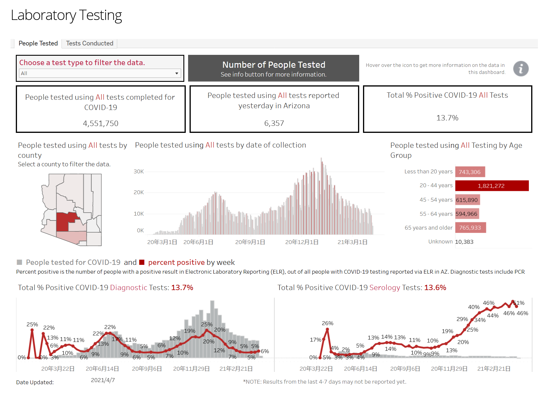 已知进行了4,089,100次Diagnostic(诊断)测试,包括昨天的5,725例,阳性率为13.7%。Serology检测(也称血清测试)进行了462,650次检测,包括昨天的632次,阳性率13.6%。亚利桑那州每周对COVID-19诊断测试的阳性率是病毒在社区中传播的指标,已连续6周保持在5%。