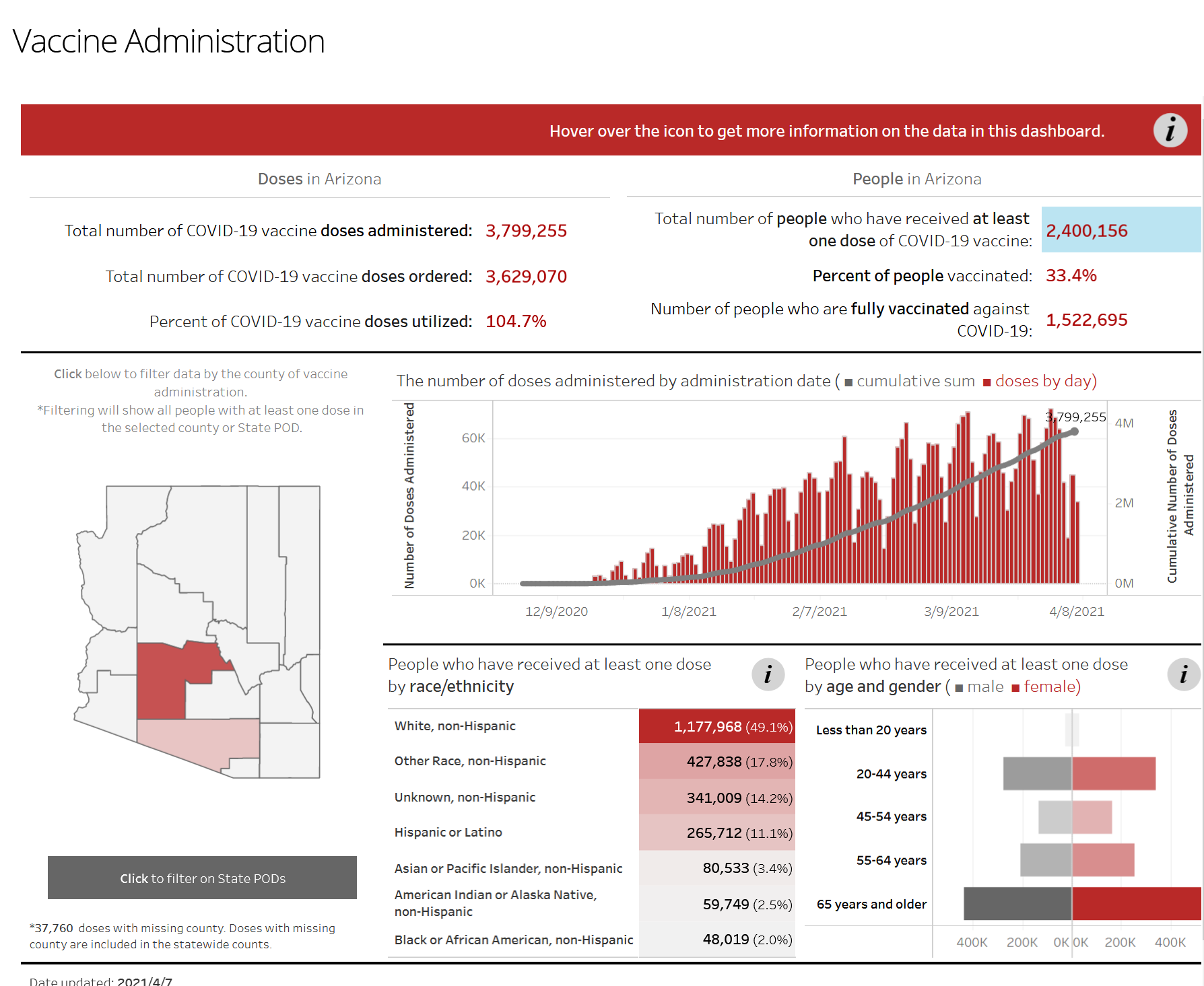 截止至周二,亚利桑那州已完成近380万剂疫苗接种,240万人完成了至少一剂注射,超152万人完成了两剂注射,全州疫苗覆盖率33.4%。