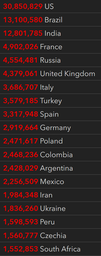 根据JHU全球新冠数据跟踪,截止至美东时间周三上午7:20,全球确诊人数累计132,597,288例,死亡累计2,866,538人。美国为全世界确诊和死亡人数最多的国家,累计确诊30,850,829例,死亡累计556,561。按County分,美国确诊人数最多的郡前三名是Los Angeles、Maricopa和Cook。死亡人数最多的三个郡分别是Los Angeles、Maricopa和Cook。