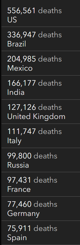 死亡人数才4月7日超17000人。之前2月17日超过15000人,2月6日死亡达到14000人,1月29日死亡达13000,1月22日死亡12000+,1月15日死亡11,000例,在1月9日死亡10,000例,在1月1日发生9,000例,在12月22日发生8,000例,在12月9日发生7,000例,在11月3日发生6,000例,在8月29日发生5,000例,在8月29日发生4,000例,7月23日有3,000例死亡,7月9日有2,000例死亡,6月5日有1,000例死亡。