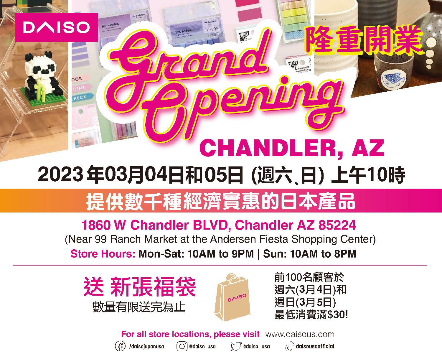 Daiso将于3月1日星期三上午10点开始在Chandler Ranch庆祝其试营业。Chandler Ranch商店的正式盛大开业时间为3月4日。3月4日和5日最低消费30美元的前100名顾客将获得一个免费的礼包。