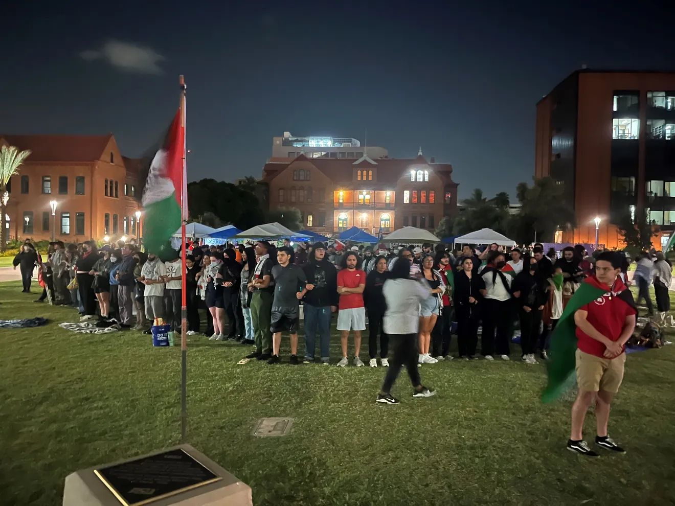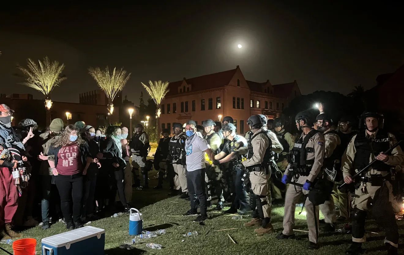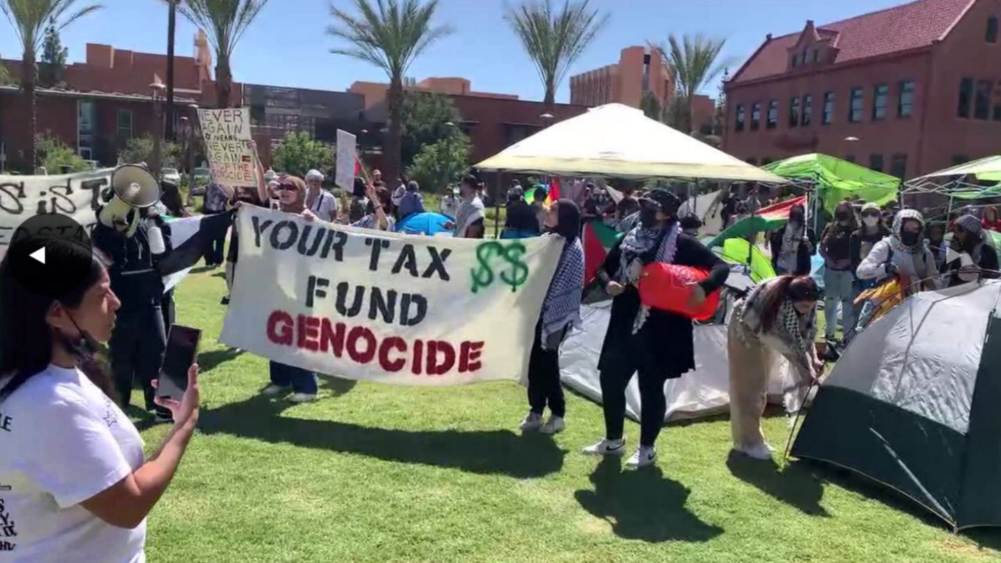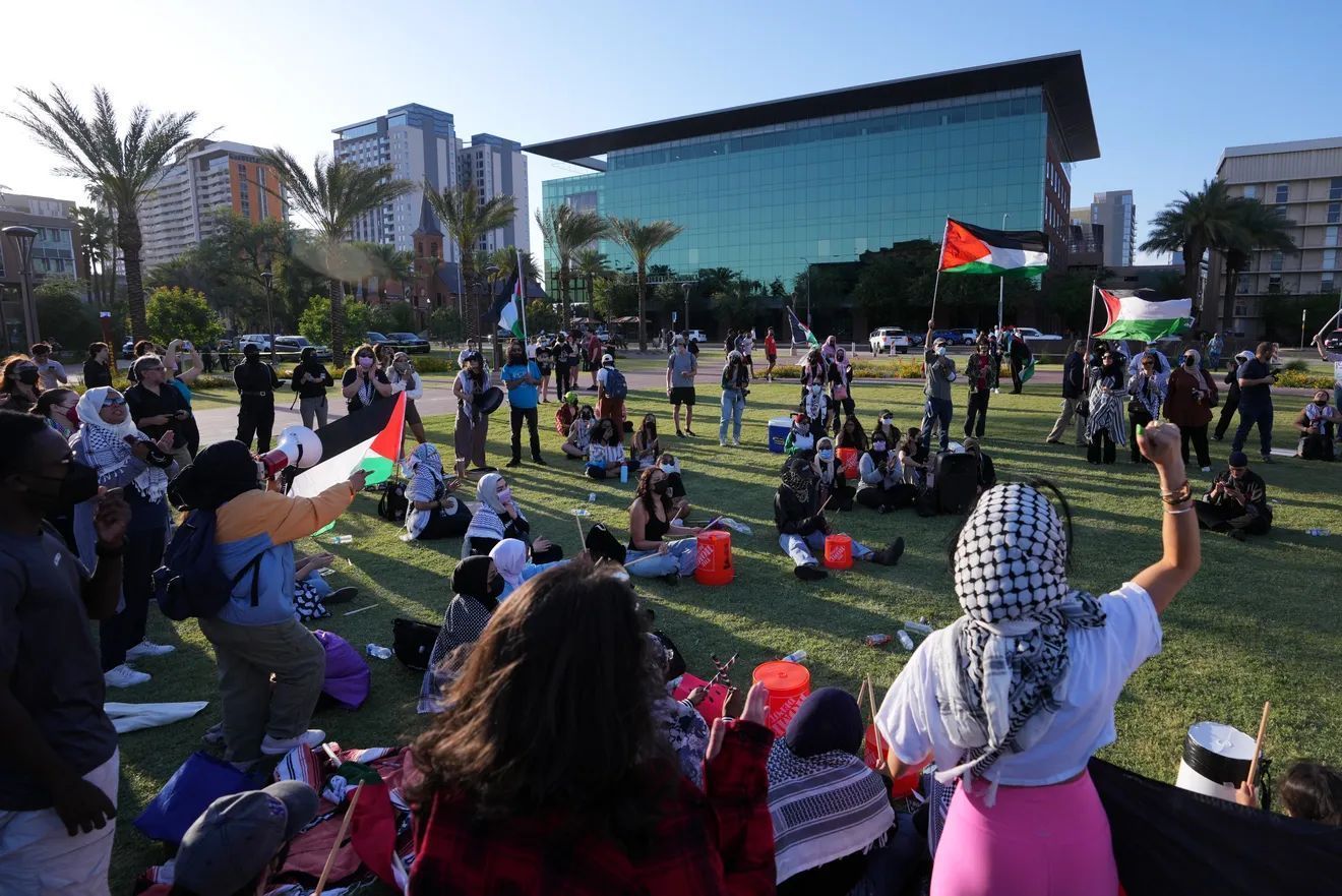 亚利桑那州立大学警察在亚利桑那州公共安全部士兵的协助下,于周五午夜左右转移到草坪边缘观察抗议活动的地方。警员把人们从帐篷里叫醒,把空帐篷拖走,并拘留了草坪上的人。