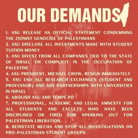 抗议者周五早上在校园内扎起帐篷,要求公开亚利桑那州立大学的所有投资清单,并要求亚利桑那州立大学从任何以色列公司剥离。一些抗议者还要求大学校长迈克尔·克劳辞职,废除亚利桑那州立大学和坦佩警察局等。抗议者在社交媒体发布8点诉求: