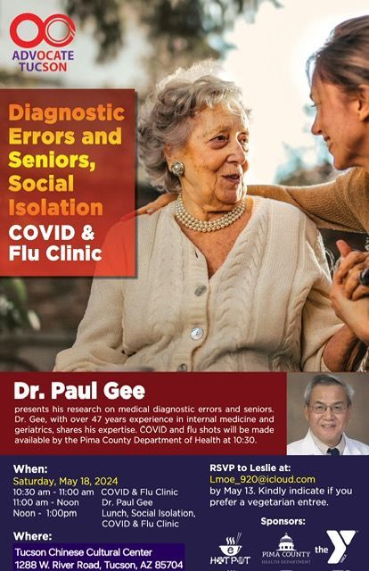 *OCATucson特别邀请到拥有超过47年的内科和老年病学经验的Paul Gee医生,在5月18日在图森中国文化中心举行义诊,义诊时间和地点如下: