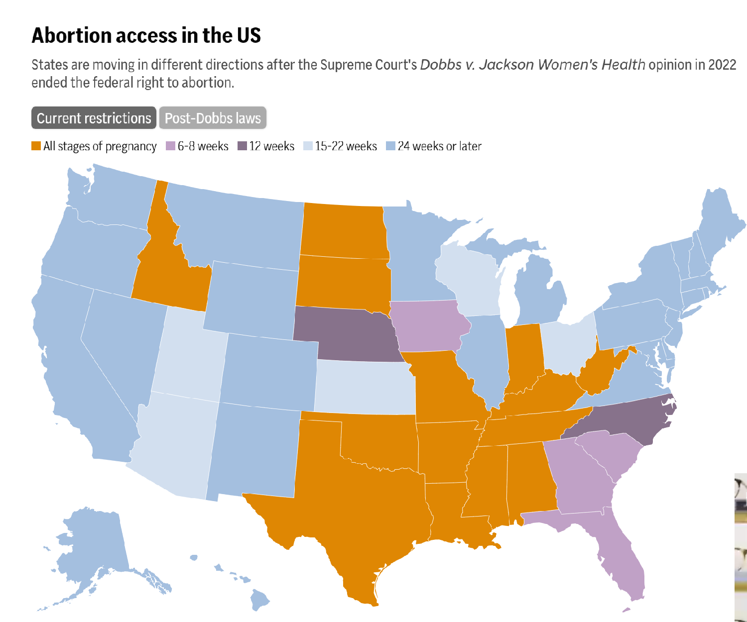 自该决定以来,大多数共和党控制的州都通过了堕胎限制,其中14个州禁止在怀孕的每个阶段进行堕胎。大多数民主党控制的州都有法律或行政命令来保护堕胎权。