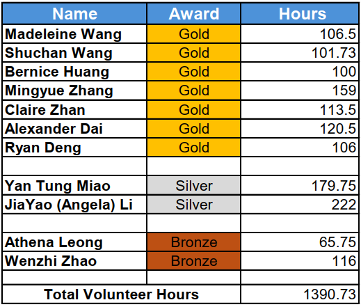 经过UCAA-YES PVSA负责人的认真详细审核,根据志愿者的年龄级别与相应义工小时数,2024年一共有十一位志愿者获奖,其中7位获得金奖,2位获得银奖,2位获得铜奖。他们在过去的一年中积极参加各种义工活动,为当地社区公益做出了无私的奉献,在他们活跃的各种公益场合,包括参加The Salvation Army,Food Bank,学校,医院,养老院,红十字协会等,孩子们用爱心和风貌提升了我们华人整体形象。