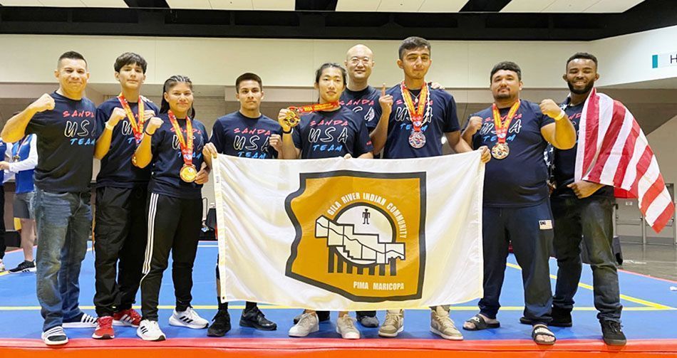 特别值得一提的是Roman Navarro是史上第一个印第安人的美国国家散打队员,是Gila River Indian Community的,图中旗子是他们部落的旗子