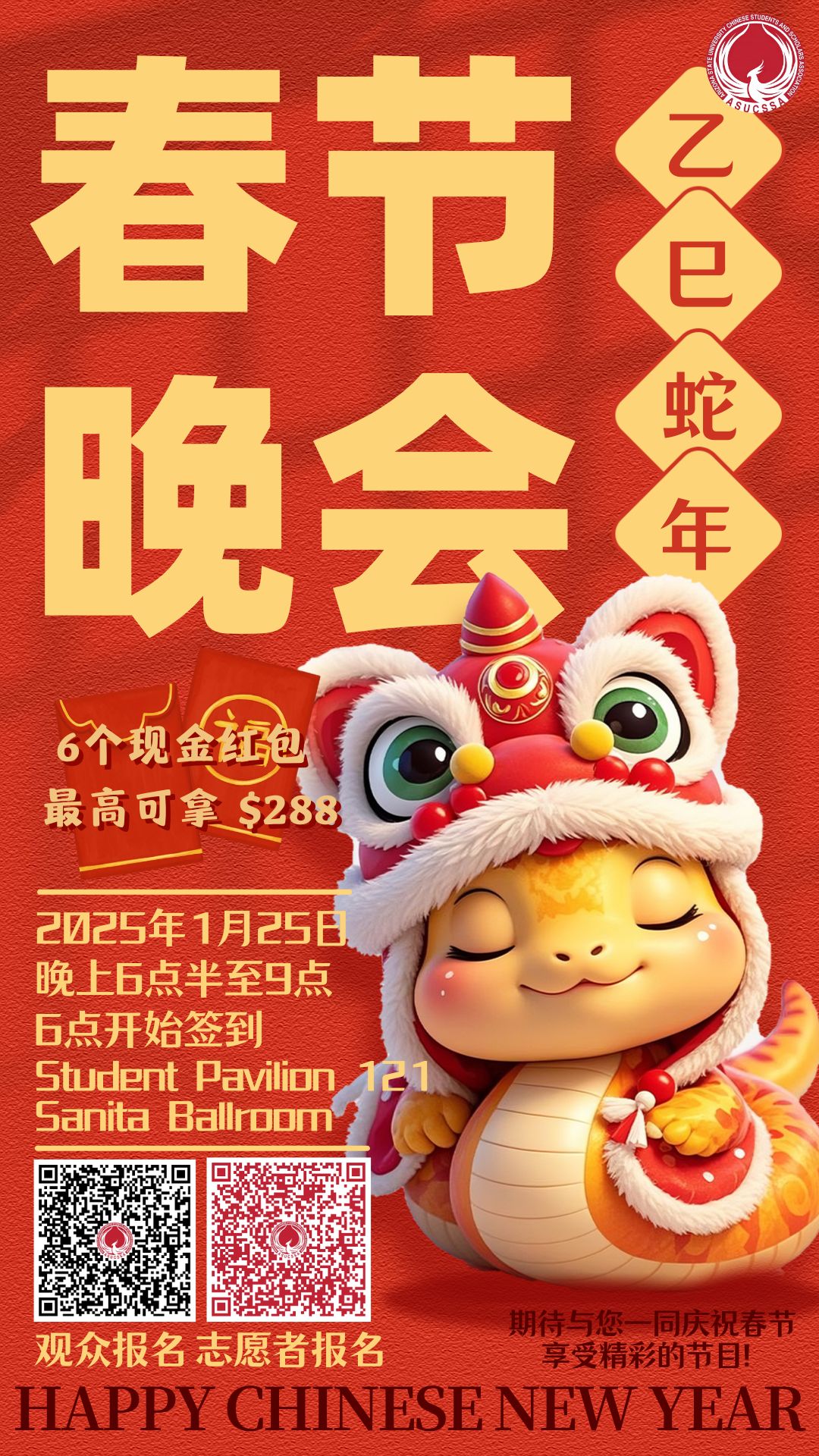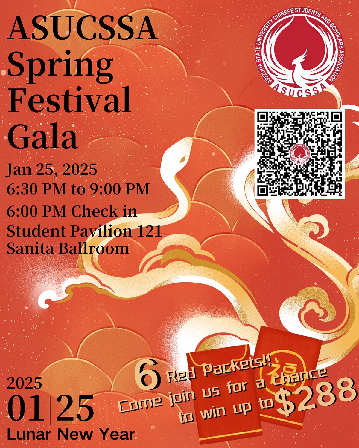 【本报讯】乙巳蛇年将近,亚利桑那州立大学学生学者联谊会(ASUCSSA)将于1月25日,举办春节晚会。据学联负责人表示,这次晚会不仅仅面向ASU留学生和访问学者、家属,更邀请华人社区的好友及所有热爱中华文化的朋友参加。报名请扫描图片1中黑色二维码。