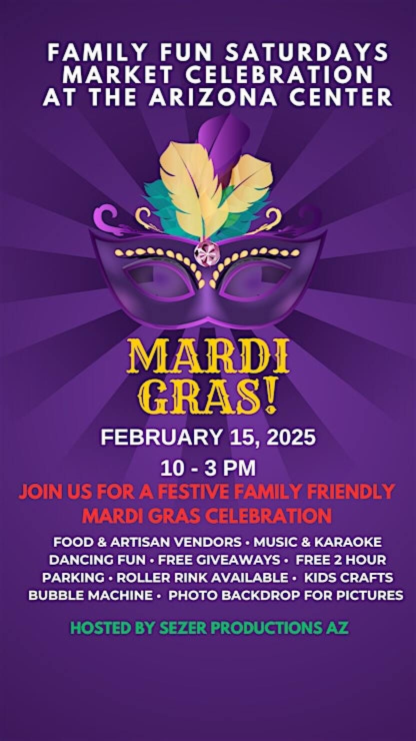 加入亚利桑那中心,享受免费的家庭欢乐周六庆祝活动,庆祝狂欢节,提供免费赠品、音乐、美食、手工艺品摊位和儿童工艺品。