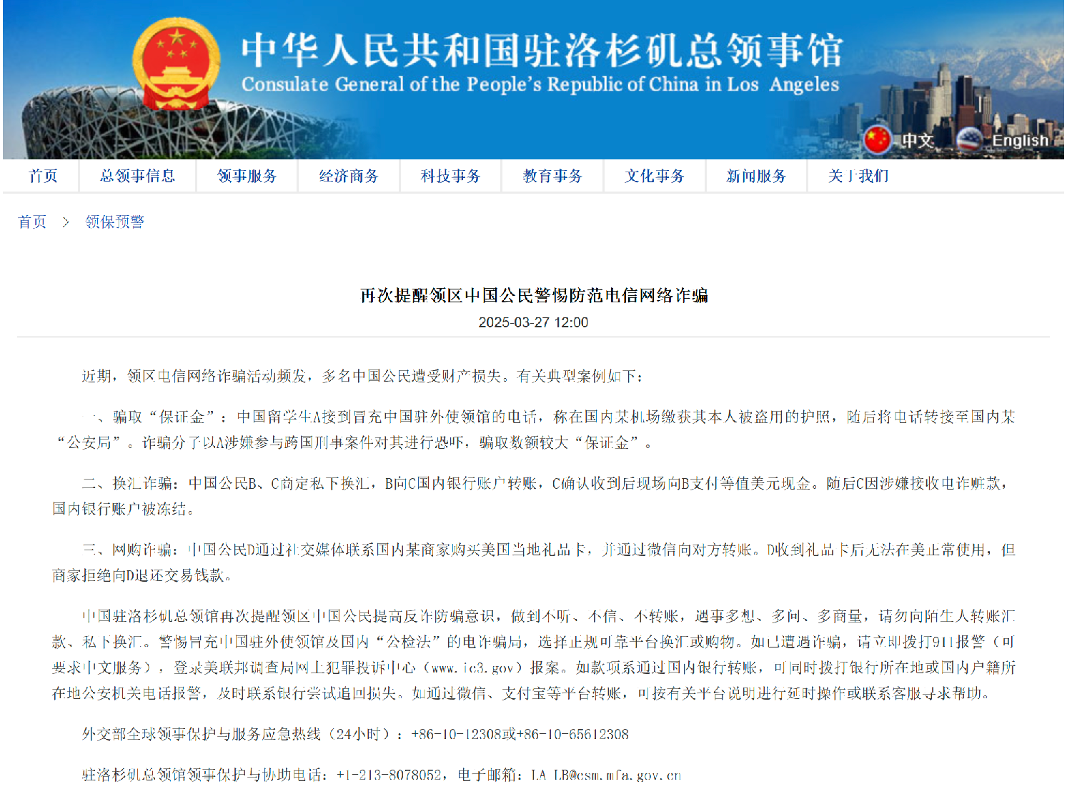 洛杉矶总领事馆提醒领区中国公民提高反诈防骗意识